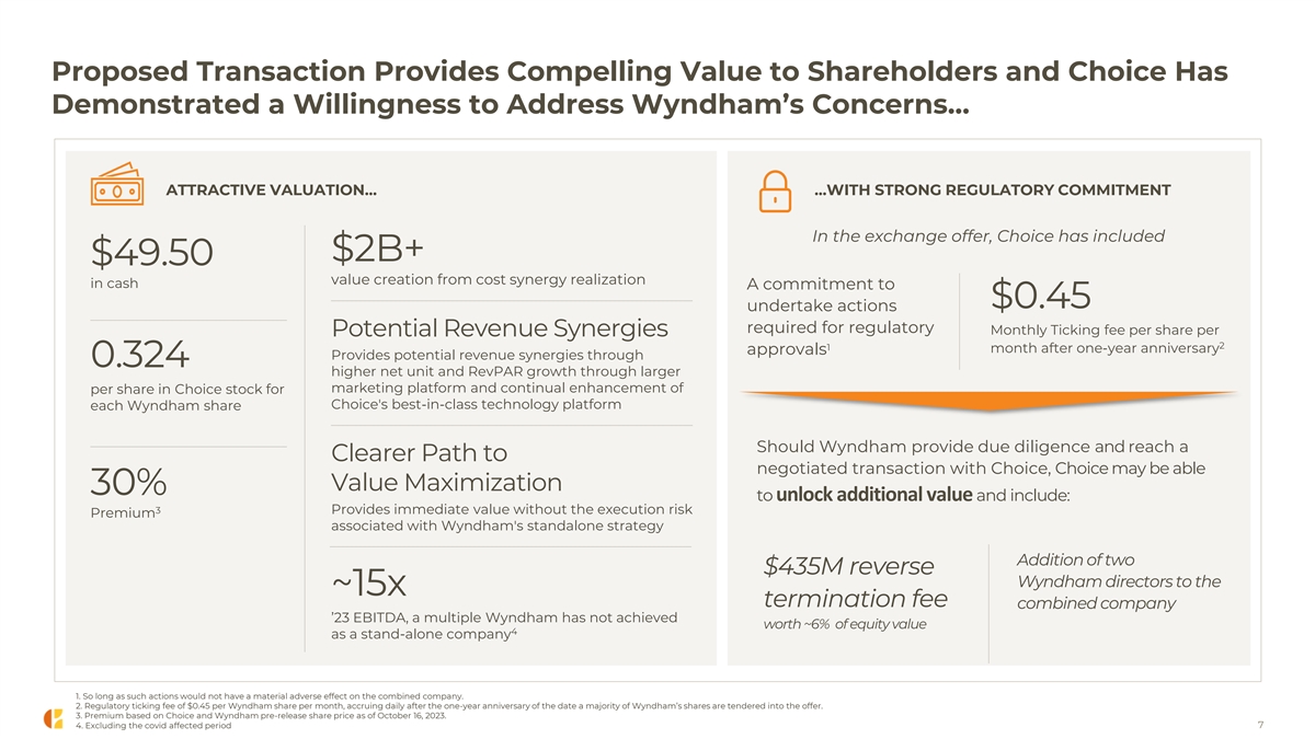 SINCE MAKING ITS OFFER PUBLIC ON OCTOBER 17, CHOICE HAS: Choice Is Committed to Completing the Enhanced its offer to the Wyndham Board by offering protections of attractive reverse Proposed termination fee, ticking fee, and strong commitment to take necessary steps to obtain regulatory approvals Transaction Acquired approximately 1.5M Wyndham shares with value exceeding $110M; essentially the maximum allowable amount without obtaining prior regulatory approval Requested the D&O questionnaire and other necessary shareholder documentation to engage in a proxy contest Made necessary regulatory filing under the Hart-Scott-Rodino (HSR) Act Choosing to proactively “start the clock” on the regulatory approval process demonstrates Choice’s focus on, and confidence in, the Choice has launched an Exchange Offer and is prepared to proposed transaction nominate a slate of Directors in connection with Wyndham’s 2024 Annual Meeting 6 6