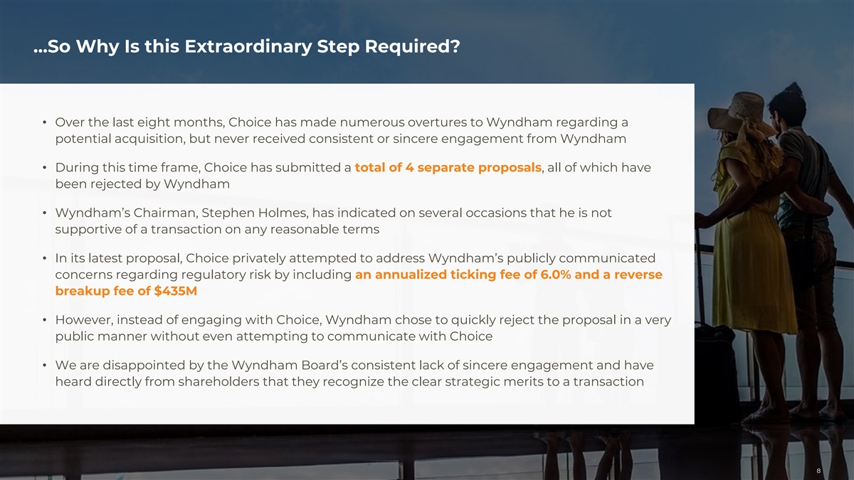 Proposed Transaction Provides Compelling Value to Shareholders and Choice Has Demonstrated a Willingness to Address Wyndham’s Concerns… ATTRACTIVE VALUATION… …WITH STRONG REGULATORY COMMITMENT In the exchange offer, Choice has included $2B+ $49.50 value creation from cost synergy realization in cash A commitment to $0.45 undertake actions required for regulatory Monthly Ticking fee per share per Potential Revenue Synergies 2 1 month after one-year anniversary approvals Provides potential revenue synergies through 0.324 higher net unit and RevPAR growth through larger marketing platform and continual enhancement of per share in Choice stock for Choice's best-in-class technology platform each Wyndham share Should Wyndham provide due diligence and reach a Clearer Path to negotiated transaction with Choice, Choice may be able Value Maximization 30% to unlock additional value and include: 3 Provides immediate value without the execution risk Premium associated with Wyndham's standalone strategy Addition of two $435M reverse Wyndham directors to the ~15x termination fee combined company ’23 EBITDA, a multiple Wyndham has not achieved worth ~6% of equity value 4 as a stand-alone company 1. So long as such actions would not have a material adverse effect on the combined company. 2. Regulatory ticking fee of $0.45 per Wyndham share per month, accruing daily after the one-year anniversary of the date a majority of Wyndham’s shares are tendered into the offer. 3. Premium based on Choice and Wyndham pre-release share price as of October 16, 2023. 4. Excluding the covid affected period 7