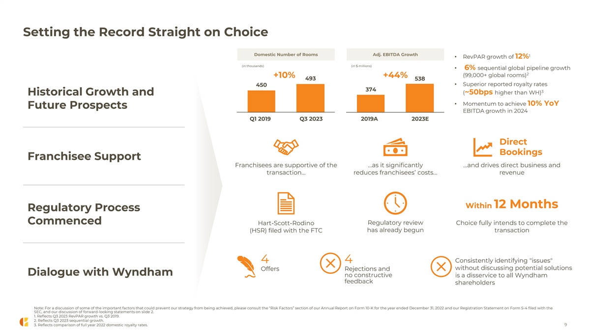 …So Why Is this Extraordinary Step Required? • Over the last eight months, Choice has made numerous overtures to Wyndham regarding a potential acquisition, but never received consistent or sincere engagement from Wyndham • During this time frame, Choice has submitted a total of 4 separate proposals, all of which have been rejected by Wyndham • Wyndham’s Chairman, Stephen Holmes, has indicated on several occasions that he is not supportive of a transaction on any reasonable terms - • In its latest proposal, Choice privately attempted to address Wyndham’s publicly communicated concerns regarding regulatory risk by including an annualized ticking fee of 6.0% and a reverse breakup fee of $435M • However, instead of engaging with Choice, Wyndham chose to quickly reject the proposal in a very public manner without even attempting to communicate with Choice • We are disappointed by the Wyndham Board’s consistent lack of sincere engagement and have heard directly from shareholders that they recognize the clear strategic merits to a transaction 8
