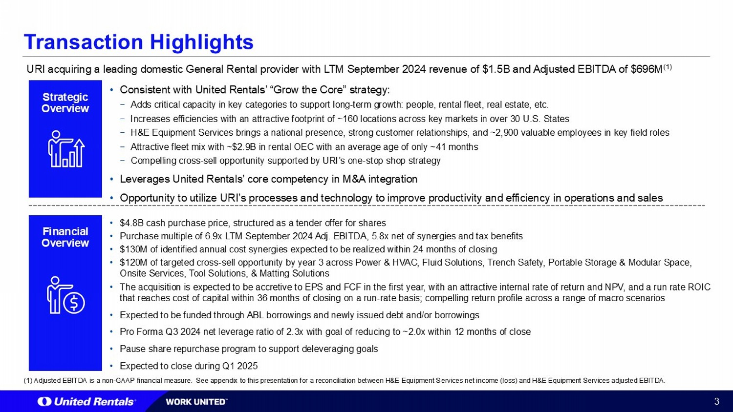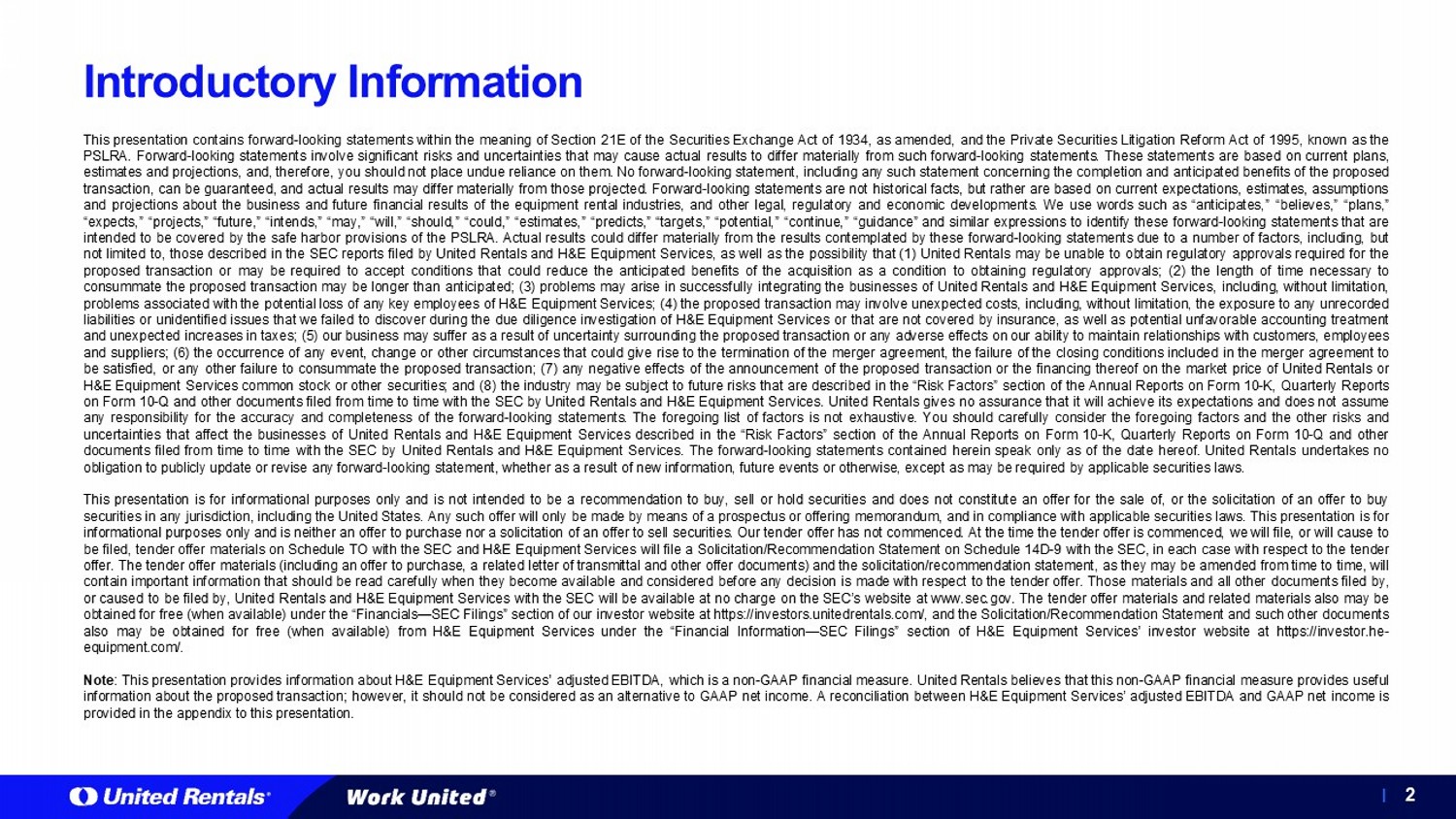 2 I This presentation contains forward - looking statements within the meaning of Section 21 E of the Securities Exchange Act of 1934 , as amended, and the Private Securities Litigation Reform Act of 1995 , known as the PSLRA . Forward - looking statements involve significant risks and uncertainties that may cause actual results to differ materially from such forward - looking statements . These statements are based on current plans, estimates and projections, and, therefore, you should not place undue reliance on them . No forward - looking statement, including any such statement concerning the completion and anticipated benefits of the proposed transaction, can be guaranteed, and actual results may differ materially from those projected . Forward - looking statements are not historical facts, but rather are based on current expectations, estimates, assumptions and projections about the business and future financial results of the equipment rental industries, and other legal, regulatory and economic developments . We use words such as “anticipates,” “believes,” “plans,” “expects,” “projects,” “future,” “intends,” “may,” “will,” “should,” “could,” “estimates,” “predicts,” “targets,” “potential,” “continue,” “guidance” and similar expressions to identify these forward - looking statements that are intended to be covered by the safe harbor provisions of the PSLRA . Actual results could differ materially from the results contemplated by these forward - looking statements due to a number of factors, including, but not limited to, those described in the SEC reports filed by United Rentals and H&E Equipment Services, as well as the possibility that ( 1 ) United Rentals may be unable to obtain regulatory approvals required for the proposed transaction or may be required to accept conditions that could reduce the anticipated benefits of the acquisition as a condition to obtaining regulatory approvals ; ( 2 ) the length of time necessary to consummate the proposed transaction may be longer than anticipated ; ( 3 ) problems may arise in successfully integrating the businesses of United Rentals and H&E Equipment Services, including, without limitation, problems associated with the potential loss of any key employees of H&E Equipment Services ; ( 4 ) the proposed transaction may involve unexpected costs, including, without limitation, the exposure to any unrecorded liabilities or unidentified issues that we failed to discover during the due diligence investigation of H&E Equipment Services or that are not covered by insurance, as well as potential unfavorable accounting treatment and unexpected increases in taxes ; ( 5 ) our business may suffer as a result of uncertainty surrounding the proposed transaction or any adverse effects on our ability to maintain relationships with customers, employees and suppliers ; ( 6 ) the occurrence of any event, change or other circumstances that could give rise to the termination of the merger agreement, the failure of the closing conditions included in the merger agreement to be satisfied, or any other failure to consummate the proposed transaction ; ( 7 ) any negative effects of the announcement of the proposed transaction or the financing thereof on the market price of United Rentals or H&E Equipment Services common stock or other securities ; and ( 8 ) the industry may be subject to future risks that are described in the “Risk Factors” section of the Annual Reports on Form 10 - K, Quarterly Reports on Form 10 - Q and other documents filed from time to time with the SEC by United Rentals and H&E Equipment Services . United Rentals gives no assurance that it will achieve its expectations and does not assume any responsibility for the accuracy and completeness of the forward - looking statements . The foregoing list of factors is not exhaustive . You should carefully consider the foregoing factors and the other risks and uncertainties that affect the businesses of United Rentals and H&E Equipment Services described in the “Risk Factors” section of the Annual Reports on Form 10 - K, Quarterly Reports on Form 10 - Q and other documents filed from time to time with the SEC by United Rentals and H&E Equipment Services . The forward - looking statements contained herein speak only as of the date hereof . United Rentals undertakes no obligation to publicly update or revise any forward - looking statement, whether as a result of new information, future events or otherwise, except as may be required by applicable securities laws . This presentation is for informational purposes only and is not intended to be a recommendation to buy, sell or hold securities and does not constitute an offer for the sale of, or the solicitation of an offer to buy securities in any jurisdiction, including the United States . Any such offer will only be made by means of a prospectus or offering memorandum, and in compliance with applicable securities laws . This presentation is for informational purposes only and is neither an offer to purchase nor a solicitation of an offer to sell securities . Our tender offer has not commenced . At the time the tender offer is commenced, we will file, or will cause to be filed, tender offer materials on Schedule TO with the SEC and H&E Equipment Services will file a Solicitation/Recommendation Statement on Schedule 14 D - 9 with the SEC, in each case with respect to the tender offer . The tender offer materials (including an offer to purchase, a related letter of transmittal and other offer documents) and the solicitation/recommendation statement, as they may be amended from time to time, will contain important information that should be read carefully when they become available and considered before any decision is made with respect to the tender offer . Those materials and all other documents filed by, or caused to be filed by, United Rentals and H&E Equipment Services with the SE