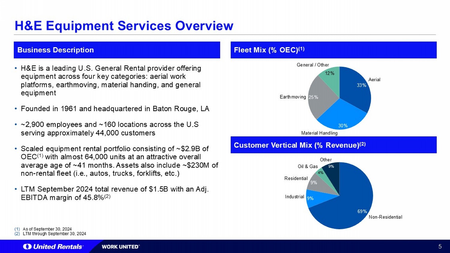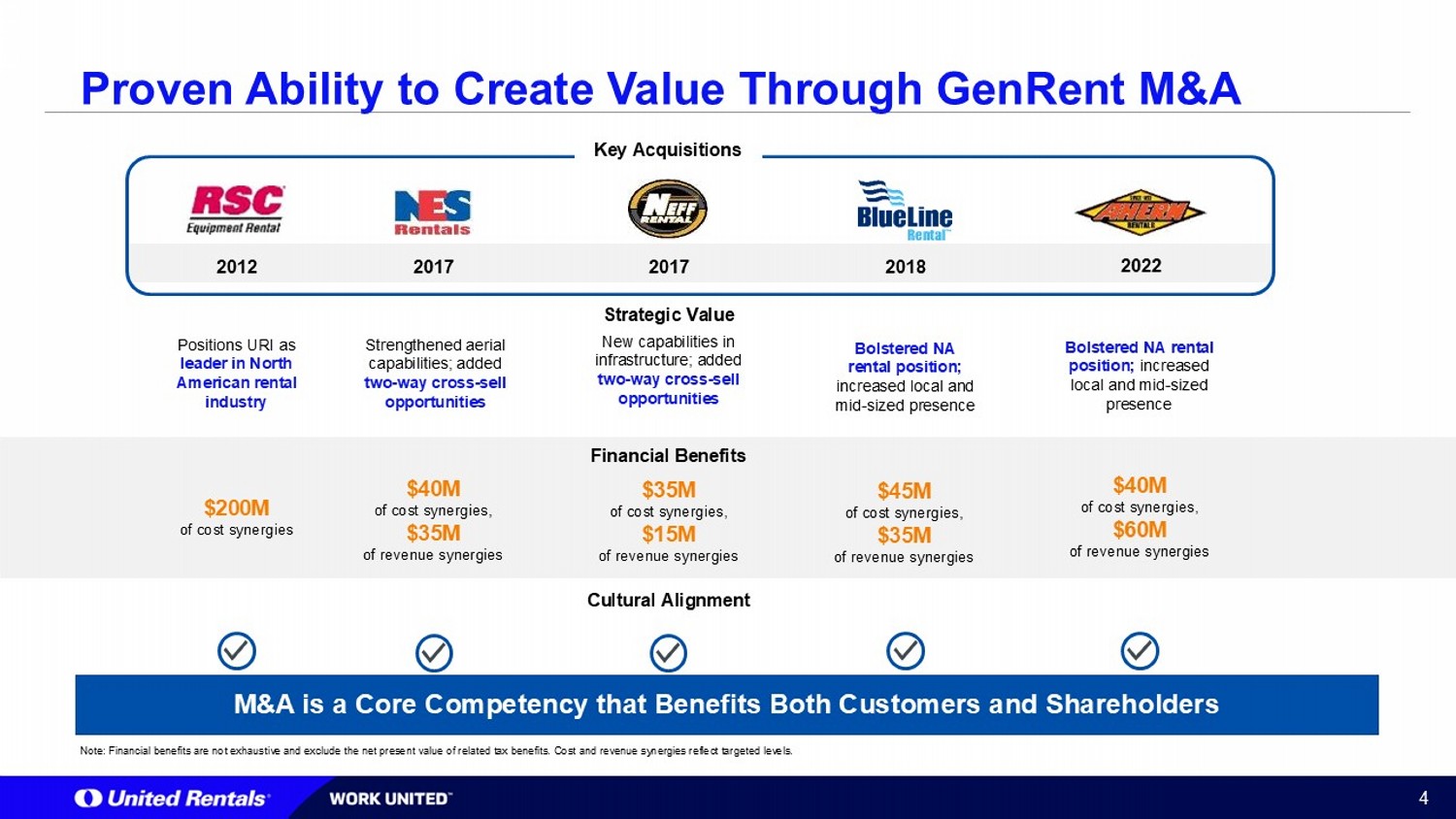 3 Transaction Highlights (1) Adjusted EBITDA is a non - GAAP financial measure. See appendix to this presentation for a reconciliation between H&E Equipment S ervices net income (loss) and H&E Equipment Services adjusted EBITDA. URI acquiring a leading domestic General Rental provider with LTM September 2024 revenue of $1.5B and Adjusted EBITDA of $ 696M (1 ) Strategic Overview Financial Overview • Consistent with United Rentals’ “Grow the Core” strategy: − Adds critical capacity in key categories to support long - term growth: people, rental fleet, real estate, etc. − Increases efficiencies with an attractive footprint of ~160 locations across key markets in over 30 U.S. States − H&E Equipment Services brings a national presence, strong customer relationships, and ~2,900 valuable employees in key field rol es − Attractive fleet mix with ~$2.9B in rental OEC with an average age of only ~41 months − Compelling cross - sell opportunity supported by URI’s one - stop shop strategy • Leverages United Rentals’ core competency in M&A integration • Opportunity to utilize URI’s processes and technology to improve productivity and efficiency in operations and sales • $ 4.8B cash purchase price, structured as a tender offer for shares • Purchase multiple of 6.9x LTM September 2024 Adj. EBITDA, 5.8x net of synergies and tax benefits • $130M of identified annual cost synergies expected to be realized within 24 months of closing • $120M of targeted cross - sell opportunity by year 3 across Power & HVAC, Fluid Solutions, Trench Safety, Portable Storage & Modul ar Space, Onsite Services, Tool Solutions, & Matting Solutions • The acquisition is expected to be accretive to EPS and FCF in the first year, with an attractive internal rate of return and NPV , and a run rate ROIC that reaches cost of capital within 36 months of closing on a run - rate basis; compelling return profile across a range of macro scenarios • Expected to be funded through ABL borrowings and newly issued debt and/or borrowings • Pro Forma Q3 2024 net leverage ratio of 2.3x with goal of reducing to ~2.0x within 12 months of close • Pause share repurchase program to support deleveraging goals • Expected to close during Q1 2025