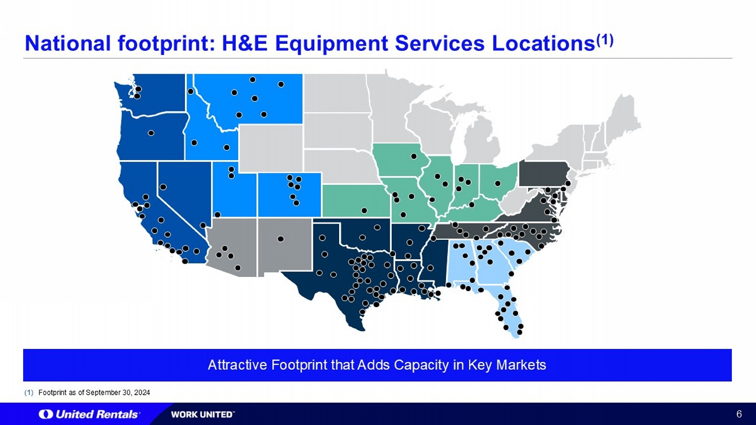 5 H&E Equipment Services Overview • H&E is a leading U.S. General Rental provider offering equipment across four key categories: aerial work platforms, earthmoving, material handing, and general equipment • Founded in 1961 and headquartered in Baton Rouge, LA • ~2,900 employees and ~160 locations across the U.S serving approximately 44,000 customers • Scaled equipment rental portfolio consisting of ~$2.9B of OEC (1) with almost 64,000 units at an attractive overall average age of ~41 months. Assets also include ~$230M of non - rental fleet (i.e., autos, trucks, forklifts, etc.) • LTM September 2024 total revenue of $1.5B with an Adj. EBITDA margin of 45.8 % (2) Business Description Fleet Mix (% OEC ) (1) Customer Vertical Mix (% Revenue ) (2) (1) As of September 30, 2024 (2) LTM through September 30, 2024 33% 30% 25% 12% Aerial Material Handling Earthmoving General / Other 69% 9% 9% 4% 9% Non - Residential Industrial Residential Oil & Gas Other
