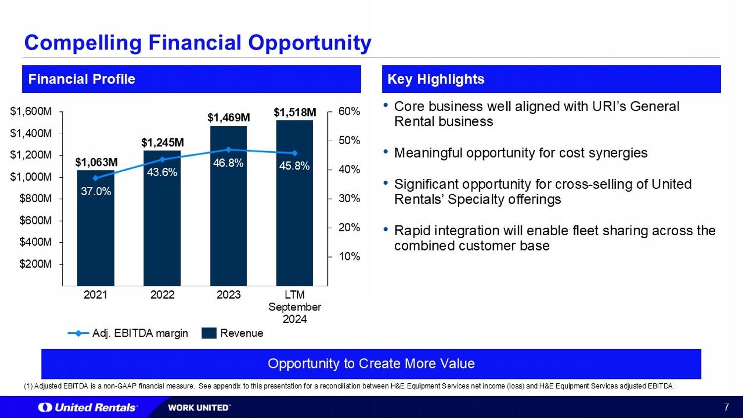 6 National footprint: H&E Equipment Services Locations (1) Attractive Footprint that Adds Capacity in Key Markets (1) Footprint as of September 30, 2024