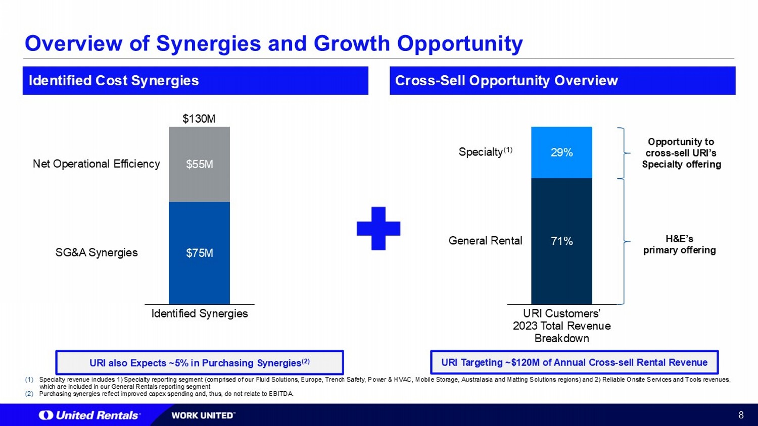 7 Compelling Financial Opportunity • Core business well aligned with URI’s General Rental business • Meaningful opportunity for cost synergies • Significant opportunity for cross - selling of United Rentals’ Specialty offerings • Rapid integration will enable fleet sharing across the combined customer base Financial Profile Key Highlights 37.0% 43.6% 46.8% 45.8% 60% $200M $400M 10% $800M $1,000M $1,200M $1,400M $1,600M 20% 30% 40% 50% $600M 2023 2022 2021 $1,063M $1,245M $1,469M $1,518M LTM September 2024 Opportunity to Create More Value (1) Adjusted EBITDA is a non - GAAP financial measure. See appendix to this presentation for a reconciliation between H&E Equipment S ervices net income (loss) and H&E Equipment Services adjusted EBITDA. Adj. EBITDA margin Revenue