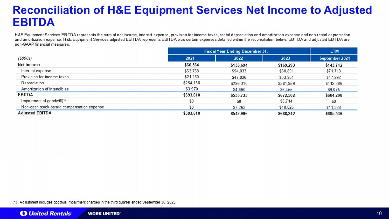 10 Reconciliation of H&E Equipment Services Net Income to Adjusted EBITDA (1) Adjustment includes goodwill impairment charges in the third quarter ended September 30, 2023. H&E Equipment Services EBITDA represents the sum of net income, interest expense, provision for income taxes, rental deprecia tio n and amortization expense and non - rental depreciation and amortization expense. H&E Equipment Services adjusted EBITDA represents EBITDA plus certain expenses detailed within the rec onciliation below. EBITDA and adjusted EBITDA are non - GAAP financial measures. LTM Fiscal Year Ending December 31, September 2024 2023 2022 2021 ($000s) $143,742 $169,293 $133,694 $60,564 Net Income $71,713 $60,891 $54,033 $53,758 Interest expense $47,292 $53,904 $47,036 $21,160 Provision for income taxes $412,386 $381,959 $296,310 $254,158 Depreciation $9,075 $6,455 $4,660 $3,970 Amortization of intangibles $684,208 $672,502 $535,733 $393,610 EBITDA $0 $5,714 $0 $0 Impairment of goodwill( 1) $11,328 $10,026 $7,263 $0 Non - cash stock - based compensation expense $695,536 $688,242 $542,996 $393,610 Adjusted EBITDA
