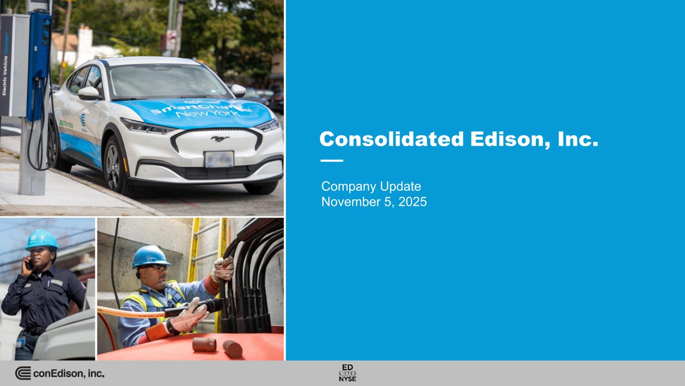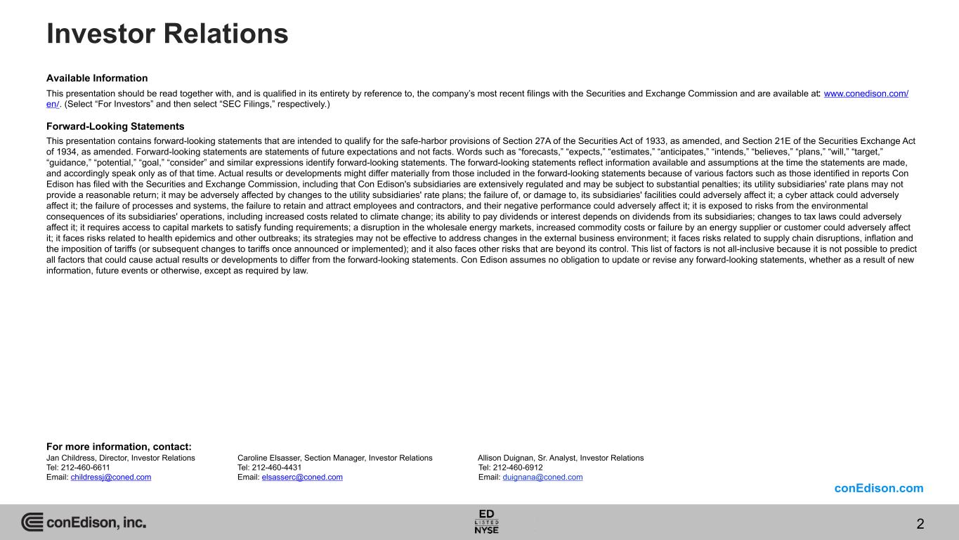 INTERNAL Available Information This presentation should be read together with, and is qualified in its entirety by reference to, the company’s most recent filings with the Securities and Exchange Commission and are available at: www.conedison.com/ en/. (Select “For Investors” and then select “SEC Filings,” respectively.) Forward-Looking Statements This presentation contains forward-looking statements that are intended to qualify for the safe-harbor provisions of Section 27A of the Securities Act of 1933, as amended, and Section 21E of the Securities Exchange Act of 1934, as amended. Forward-looking statements are statements of future expectations and not facts. Words such as “forecasts,” “expects,” “estimates,” “anticipates,” “intends,” “believes,” “plans,” “will,” “target,” “guidance,” “potential,” “goal,” “consider” and similar expressions identify forward-looking statements. The forward-looking statements reflect information available and assumptions at the time the statements are made, and accordingly speak only as of that time. Actual results or developments might differ materially from those included in the forward-looking statements because of various factors such as those identified in reports Con Edison has filed with the Securities and Exchange Commission, including that Con Edison's subsidiaries are extensively regulated and may be subject to substantial penalties; its utility subsidiaries' rate plans may not provide a reasonable return; it may be adversely affected by changes to the utility subsidiaries' rate plans; the failure of, or damage to, its subsidiaries' facilities could adversely affect it; a cyber attack could adversely affect it; the failure of processes and systems, the failure to retain and attract employees and contractors, and their negative performance could adversely affect it; it is exposed to risks from the environmental consequences of its subsidiaries' operations, including increased costs related to climate change; its ability to pay dividends or interest depends on dividends from its subsidiaries; changes to tax laws could adversely affect it; it requires access to capital markets to satisfy funding requirements; a disruption in the wholesale energy markets, increased commodity costs or failure by an energy supplier or customer could adversely affect it; it faces risks related to health epidemics and other outbreaks; its strategies may not be effective to address changes in the external business environment; it faces risks related to supply chain disruptions, inflation and the imposition of tariffs (or subsequent changes to tariffs once announced or implemented); and it also faces other risks that are beyond its control. This list of factors is not all-inclusive because it is not possible to predict all factors that could cause actual results or developments to differ from the forward-looking statements. Con Edison assumes no obligation to update or revise any forward-looking statements, whether as a result of new information, future events or otherwise, except as required by law. For more information, contact: Jan Childress, Director, Investor Relations Caroline Elsasser, Section Manager, Investor Relations Allison Duignan, Sr. Analyst, Investor Relations Tel: 212-460-6611 Tel: 212-460-4431 Tel: 212-460-6912 Email: childressj@coned.com Email: elsasserc@coned.com Email: duignana@coned.com Investor Relations conEdison.com 2