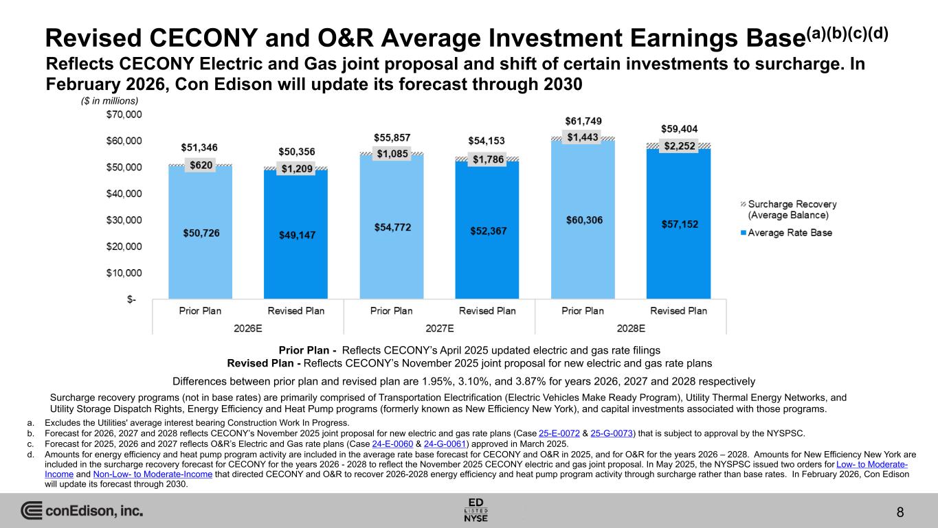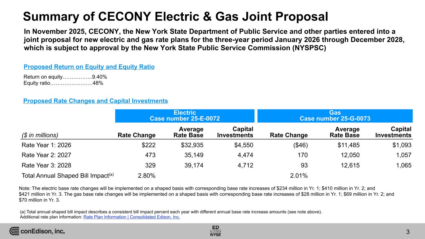 INTERNAL 33 Summary of CECONY Electric & Gas Joint Proposal (a) Total annual shaped bill impact describes a consistent bill impact percent each year with different annual base rate increase amounts (see note above). Additional rate plan information: Rate Plan Information | Consolidated Edison, Inc. Electric Case number 25-E-0072 Gas Case number 25-G-0073 ($ in millions) Rate Change Average Rate Base Capital Investments Rate Change Average Rate Base Capital Investments Rate Year 1: 2026 $222 $32,935 $4,550 ($46) $11,485 $1,093 Rate Year 2: 2027 473 35,149 4,474 170 12,050 1,057 Rate Year 3: 2028 329 39,174 4,712 93 12,615 1,065 Total Annual Shaped Bill Impact(a) 2.80% 2.01% In November 2025, CECONY, the New York State Department of Public Service and other parties entered into a joint proposal for new electric and gas rate plans for the three-year period January 2026 through December 2028, which is subject to approval by the New York State Public Service Commission (NYSPSC) Return on equity……………..9.40% Equity ratio……………………48% Proposed Return on Equity and Equity Ratio Proposed Rate Changes and Capital Investments Note: The electric base rate changes will be implemented on a shaped basis with corresponding base rate increases of $234 million in Yr. 1; $410 million in Yr. 2; and $421 million in Yr. 3. The gas base rate changes will be implemented on a shaped basis with corresponding base rate increases of $28 million in Yr. 1; $69 million in Yr. 2; and $70 million in Yr. 3.