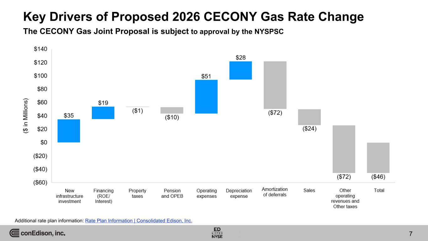 INTERNAL (a) The Joint Proposal is subject to approval by the NYSPSC Additional rate plan information: Rate Plan Information | Consolidated Edison, Inc. CECONY Electric and Gas Rate Case - Comparison of Filings(a) 4 Electric Gas ($ in millions) Case number 25-E-0072 Case number 25-G-0073 Rate Year 1: Jan 2026 - Dec 2026 Jan 2025 Filing Apr 2025 Update May 2025 Staff/ Intervenor Testimony Nov 2025 Joint Proposal Jan 2025 Filing Apr 2025 Update May 2025 Staff/ Intervenor Testimony Nov 2025 Joint Proposal New infrastructure investment $370 $411 $204 $300 $65 $58 $5 $35 Financing 210 190 33 54 74 65 12 19 Property taxes 434 436 167 147 64 38 (22) (1) Pension and OPEB 240 225 203 142 20 13 12 (10) Operating expenses 360 322 75 58 100 91 44 51 Depreciation expense 136 125 22 (23) 96 89 31 28 Amortization of deferrals (92) (110) (270) (311) 10 1 (62) (72) Sales (57) (26) (39) (60) 24 7 (29) (24) Other operating revenues and Other taxes 11 35 (76) (85) (12) (13) (36) (72) Total Rate Increase (Decrease) $1,612 $1,608 $319 $222 $441 $349 $(45) ($46) Average Rate Base $33,750 $34,249 $31,856 $32,935 $11,830 $11,750 $11,132 $11,485 ROE 10.10% 10.00% 9.30% 9.40% 10.10% 10.00% 9.30% 9.40% Equity Ratio 48% 48% 48% 48% 48% 48% 48% 48%