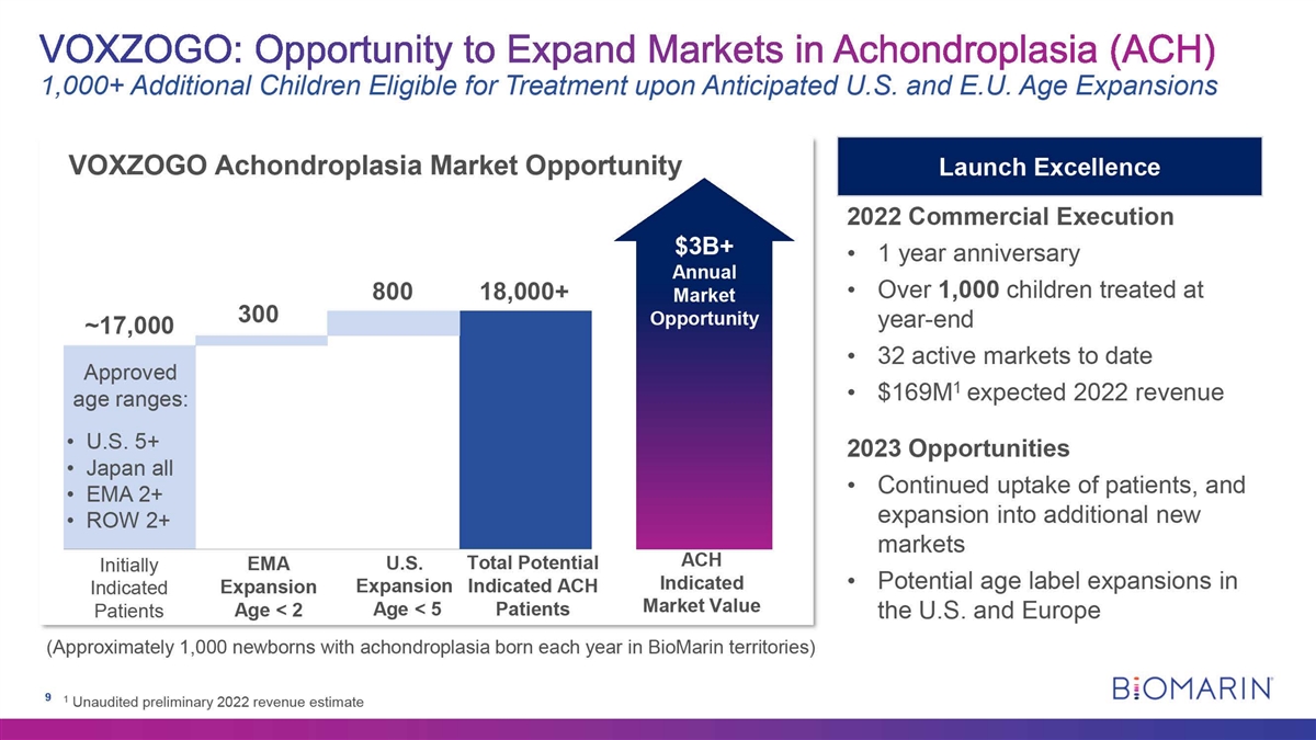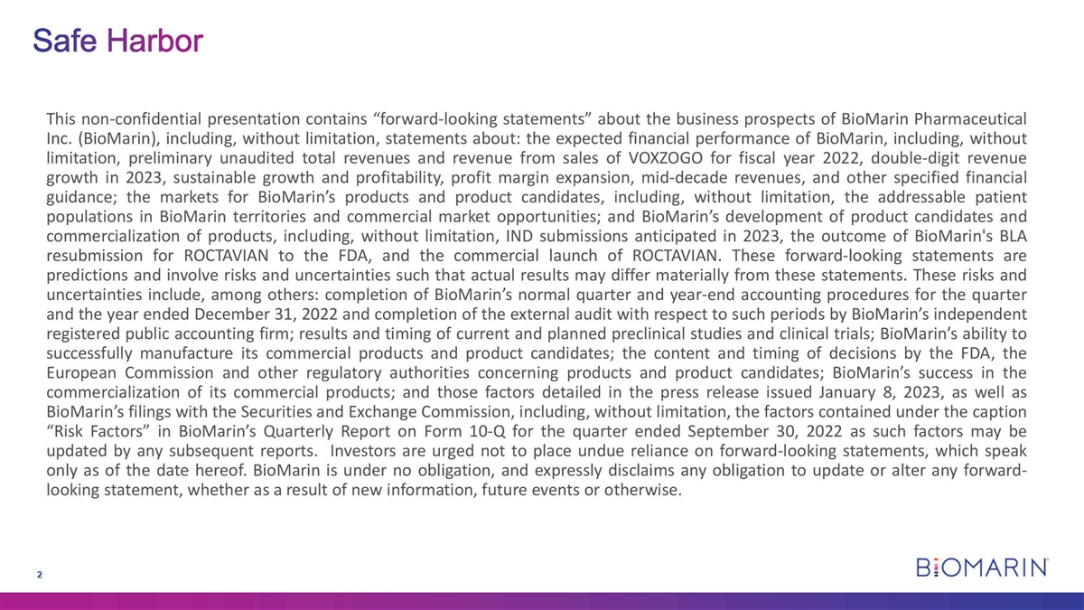 Safe Harbor This non -confidential presentation contains forward-looking statements about the business prospects of BioMarin Pharmaceutical Inc. (BioMarin), including, without limitation, statements about: the expected financial performance of BioMarin, including, without limitation, preliminary unaudited total revenues and revenue from sales of VOXZOGO for fiscal year 2022, double-digit revenue growth in 2023, sustainable growth and profitability, profit margin expansion, mid-decade revenues, and other specified financial guidance; the markets for BioMarin's products and product candidates, including, without limitation, the addressable patient populations in BioMarin territories and commercial market opportunities; and BioMarin's development of product candidates and commercialization of products, including, without limitation, IND submissions anticipated in 2023, the outcome of BioMarin's BLA resubmission for ROCTAVIAN to the FDA, and the commercial launch of ROCTAVIAN. These forward-looking statements are predictions and involve risks and uncertainties such that actual results may differ materially from these statements. These risks and uncertainties include, among others: completion of BioMarin's normal quarter and year-end accounting procedures for the quarter and the year ended December 31, 2022 and completion of the external audit with respect to such periods by BioMarin's independent registered public accounting firm; results and timing of current and planned preclinical studies and clinical trials; BioMarin's ability to successfully manufacture its commercial products and product candidates; the content and timing of decisions by the FDA, the European Commission and other regulatory authorities concerning products and product candidates; BioMarin's success in the commercialization of its commercial products; and those factors detailed in the press release issued January 8, 2023, as well as BioMarin's filings with the Securities and Exchange Commission, including, without limitation, the factors contained under the caption Risk Factors in BioMarin's Quarterly Report on Form 10-Q for the quarter ended September 30, 2022 as such factors may be updated by any subsequent reports. Investors are urged not to place undue reliance on forward -looking statements, which speak only as of the date hereof. BioMarin is under no obligation, and expressly disclaims any obligation to update or alter any forward - looking statement, whether as a result of new information, future events or otherwise. BiOMARI N 2