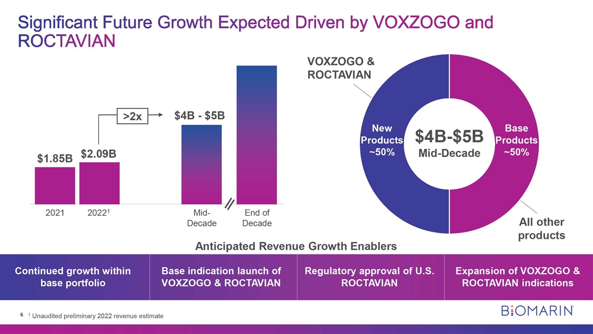 Significant Future Growth Expected Driven by VOXZOGO and ROCTAVIAN VOXZOGO & ROCTAVIAN N $46 - $56 >2x New Base $4B-$5B Products Products -50% -50% Mid-Decade $2.09B $1.85B N 2021 20221 Mid- / End of Decade Decade All other products Anticipated Revenue Growth Enablers Continued growth within Base indication launch of Regulatory approval of U.S. Expansion of VOXZOGO & base portfolio VOXZOGO & ROCTAVIAN ROCTAVIAN ROCTAVIAN indications BIOMARIN 6 1 Unaudited preliminary 2022 revenue estimate