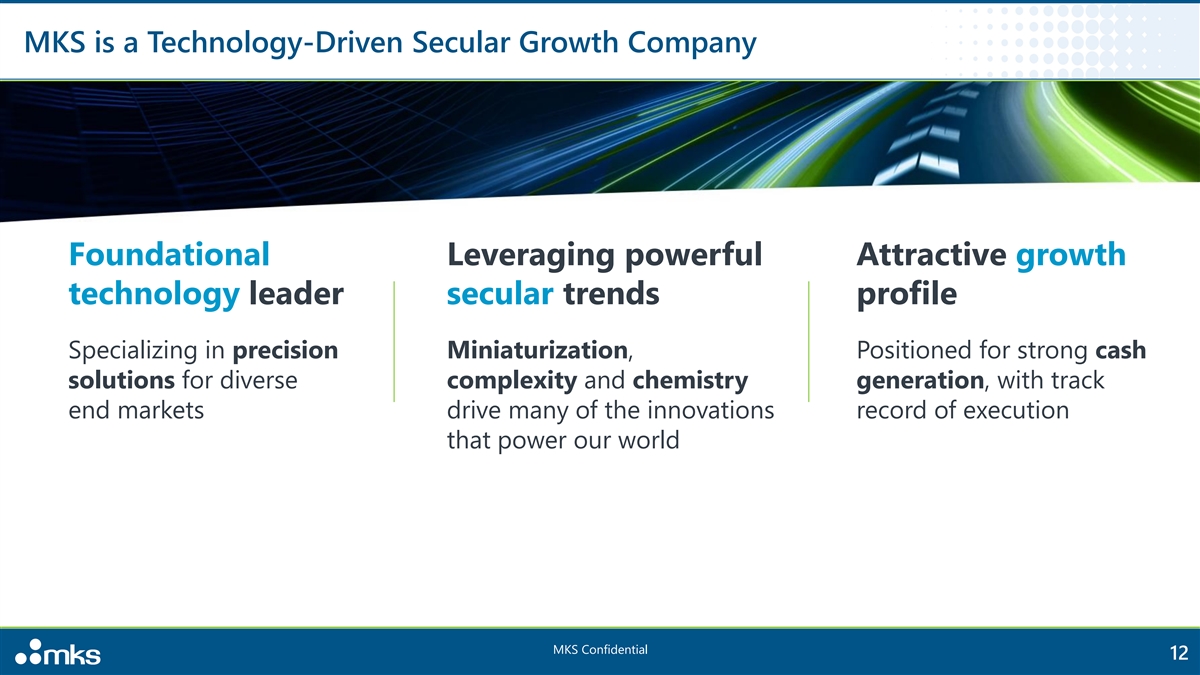 MKS is a Technology-Driven Secular Growth Company Foundational Leveraging powerful Attractive growth technology leader secular trends profile Specializing in precision Miniaturization, Positioned for strong cash solutions for diverse complexity and chemistry generation, with track end markets drive many of the innovations record of execution that power our world MKS Confidential 12