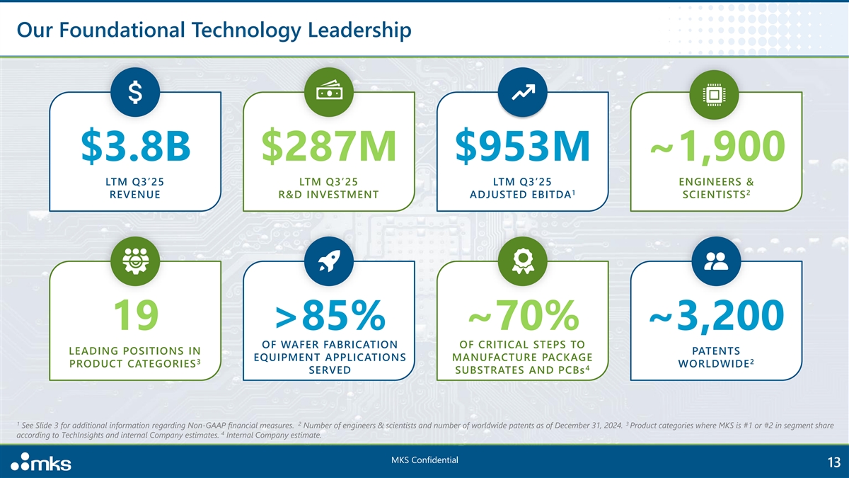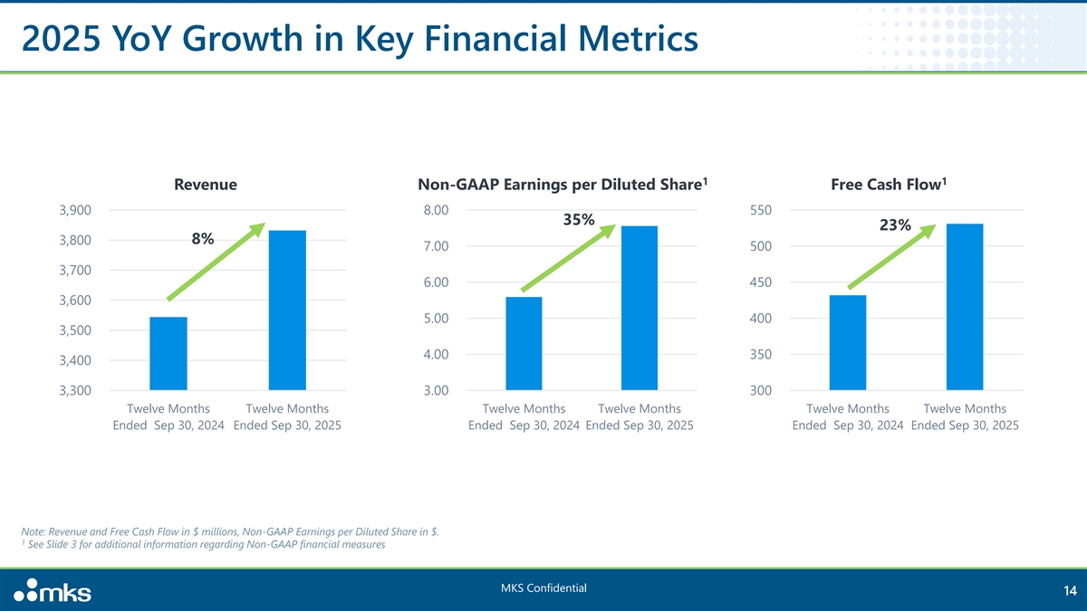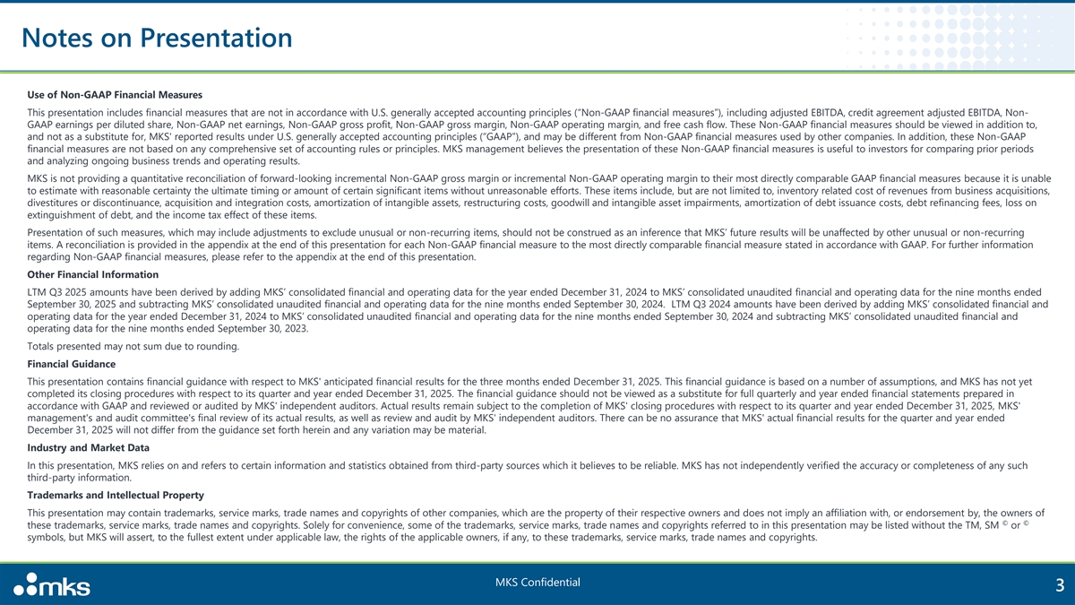 Notes on Presentation Use of Non-GAAP Financial Measures This presentation includes financial measures that are not in accordance with U.S. generally accepted accounting principles (“Non-GAAP financial measures”), including adjusted EBITDA, credit agreement adjusted EBITDA, Non- GAAP earnings per diluted share, Non-GAAP net earnings, Non-GAAP gross profit, Non-GAAP gross margin, Non-GAAP operating margin, and free cash flow. These Non-GAAP financial measures should be viewed in addition to, and not as a substitute for, MKS' reported results under U.S. generally accepted accounting principles (“GAAP”), and may be different from Non-GAAP financial measures used by other companies. In addition, these Non-GAAP financial measures are not based on any comprehensive set of accounting rules or principles. MKS management believes the presentation of these Non-GAAP financial measures is useful to investors for comparing prior periods and analyzing ongoing business trends and operating results. MKS is not providing a quantitative reconciliation of forward-looking incremental Non-GAAP gross margin or incremental Non-GAAP operating margin to their most directly comparable GAAP financial measures because it is unable to estimate with reasonable certainty the ultimate timing or amount of certain significant items without unreasonable efforts. These items include, but are not limited to, inventory related cost of revenues from business acquisitions, divestitures or discontinuance, acquisition and integration costs, amortization of intangible assets, restructuring costs, goodwill and intangible asset impairments, amortization of debt issuance costs, debt refinancing fees, loss on extinguishment of debt, and the income tax effect of these items. Presentation of such measures, which may include adjustments to exclude unusual or non-recurring items, should not be construed as an inference that MKS’ future results will be unaffected by other unusual or non-recurring items. A reconciliation is provided in the appendix at the end of this presentation for each Non-GAAP financial measure to the most directly comparable financial measure stated in accordance with GAAP. For further information regarding Non-GAAP financial measures, please refer to the appendix at the end of this presentation. Other Financial Information LTM Q3 2025 amounts have been derived by adding MKS’ consolidated financial and operating data for the year ended December 31, 2024 to MKS’ consolidated unaudited financial and operating data for the nine months ended September 30, 2025 and subtracting MKS’ consolidated unaudited financial and operating data for the nine months ended September 30, 2024. LTM Q3 2024 amounts have been derived by adding MKS’ consolidated financial and operating data for the year ended December 31, 2024 to MKS’ consolidated unaudited financial and operating data for the nine months ended September 30, 2024 and subtracting MKS’ consolidated unaudited financial and operating data for the nine months ended September 30, 2023. Totals presented may not sum due to rounding. Financial Guidance This presentation contains financial guidance with respect to MKS' anticipated financial results for the three months ended December 31, 2025. This financial guidance is based on a number of assumptions, and MKS has not yet completed its closing procedures with respect to its quarter and year ended December 31, 2025. The financial guidance should not be viewed as a substitute for full quarterly and year ended financial statements prepared in accordance with GAAP and reviewed or audited by MKS' independent auditors. Actual results remain subject to the completion of MKS' closing procedures with respect to its quarter and year ended December 31, 2025, MKS' management's and audit committee's final review of its actual results, as well as review and audit by MKS' independent auditors. There can be no assurance that MKS' actual financial results for the quarter and year ended December 31, 2025 will not differ from the guidance set forth herein and any variation may be material. Industry and Market Data In this presentation, MKS relies on and refers to certain information and statistics obtained from third-party sources which it believes to be reliable. MKS has not independently verified the accuracy or completeness of any such third-party information. Trademarks and Intellectual Property This presentation may contain trademarks, service marks, trade names and copyrights of other companies, which are the property of their respective owners and does not imply an affiliation with, or endorsement by, the owners of © © these trademarks, service marks, trade names and copyrights. Solely for convenience, some of the trademarks, service marks, trade names and copyrights referred to in this presentation may be listed without the TM, SM or symbols, but MKS will assert, to the fullest extent under applicable law, the rights of the applicable owners, if any, to these trademarks, service marks, trade names and copyrights. MKS Confidential 3
