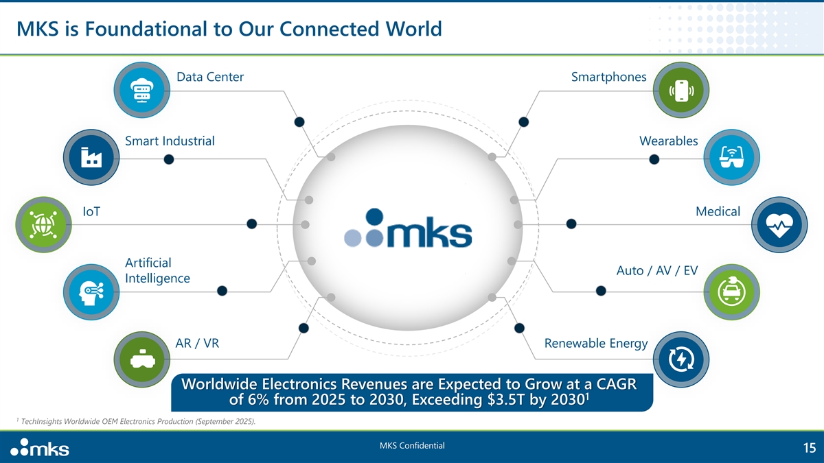 2025 YoY Growth in Key Financial Metrics 1 1 Revenue Non-GAAP Earnings per Diluted Share Free Cash Flow 3,900 8.00 550 35% 23% 3,800 8% 7.00 500 3,700 6.00 450 3,600 5.00 400 3,500 4.00 350 3,400 3,300 3.00 300 Twelve Months Twelve Months Twelve Months Twelve Months Twelve Months Twelve Months Ended Sep 30, 2024 Ended Sep 30, 2025 Ended Sep 30, 2024 Ended Sep 30, 2025 Ended Sep 30, 2024 Ended Sep 30, 2025 Note: Revenue and Free Cash Flow in $ millions, Non-GAAP Earnings per Diluted Share in $. 1 See Slide 3 for additional information regarding Non-GAAP financial measures MKS Confidential 14