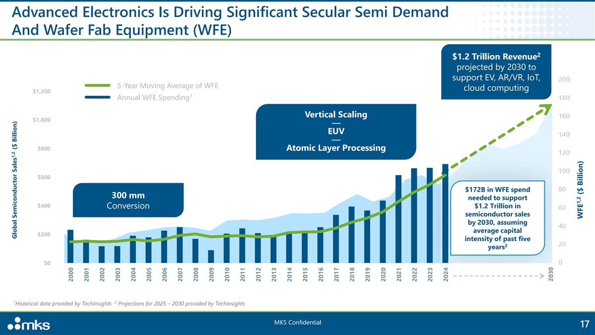 Advanced Electronics Is Driving Significant Secular Semi Demand And Wafer Fab Equipment (WFE) 2 $1.2 Trillion Revenue projected by 2030 to support EV, AR/VR, IoT, 5-Year Moving Average of WFE cloud computing $1,200 1 Annual WFE Spending Vertical Scaling $1,000 — EUV — $800 Atomic Layer Processing $600 $172B in WFE spend 300 mm needed to support $400 Conversion $1.2 Trillion in semiconductor sales by 2030, assuming average capital $200 intensity of past five 2 years $0 1 2 Historical data provided by TechInsights Projections for 2025 – 2030 provided by TechInsights MKS Confidential 17 1,2 Global Semiconductor Sales ($ Billion) 2000 2001 2002 2003 2004 2005 2006 2007 2008 2009 2010 2011 2012 2013 2014 2015 2016 2017 2018 2019 2020 2021 2022 2023 2024 2030 1,2 WFE ($ Billion)