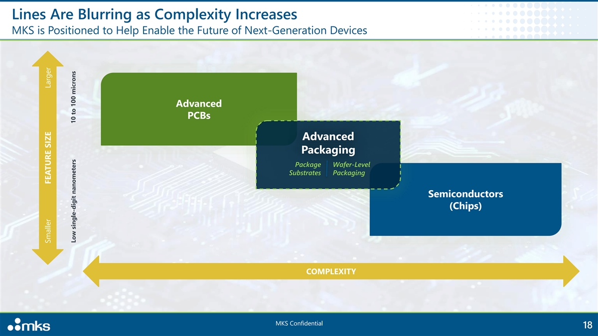 Lines Are Blurring as Complexity Increases MKS is Positioned to Help Enable the Future of Next-Generation Devices Advanced PCBs Advanced Packaging Package Wafer-Level Substrates Packaging Semiconductors (Chips) COMPLEXITY MKS Confidential 18 Smaller Larger FEATURE SIZE 10 to 100 microns Low single-digit nanometers