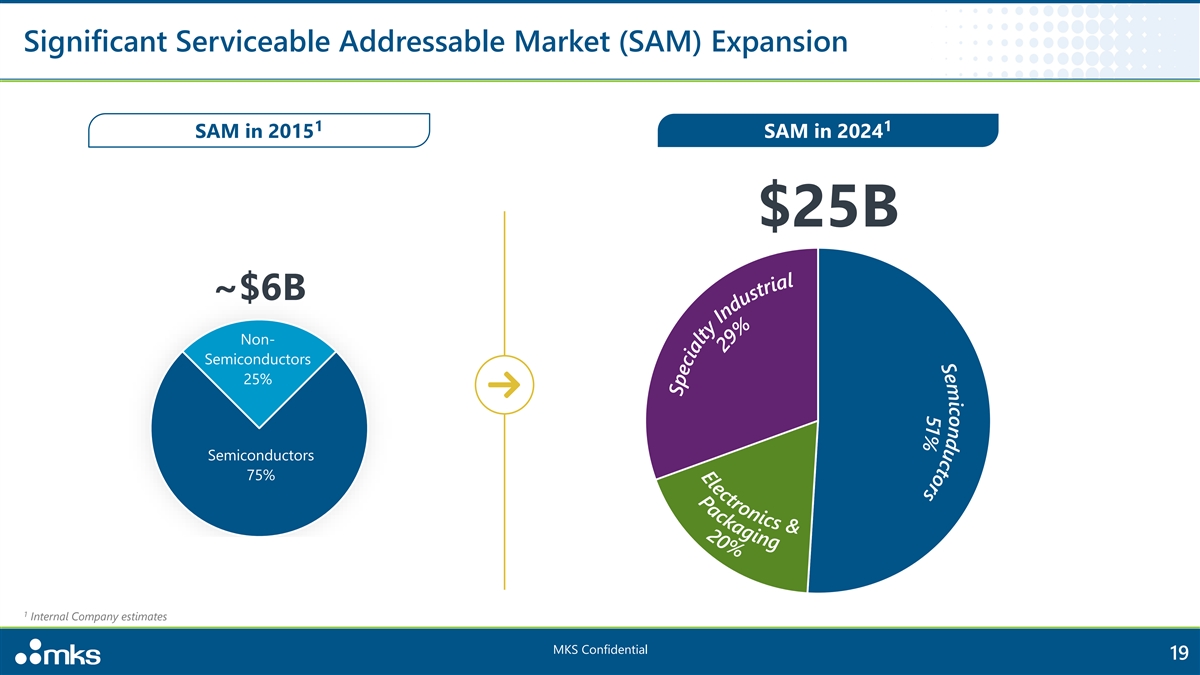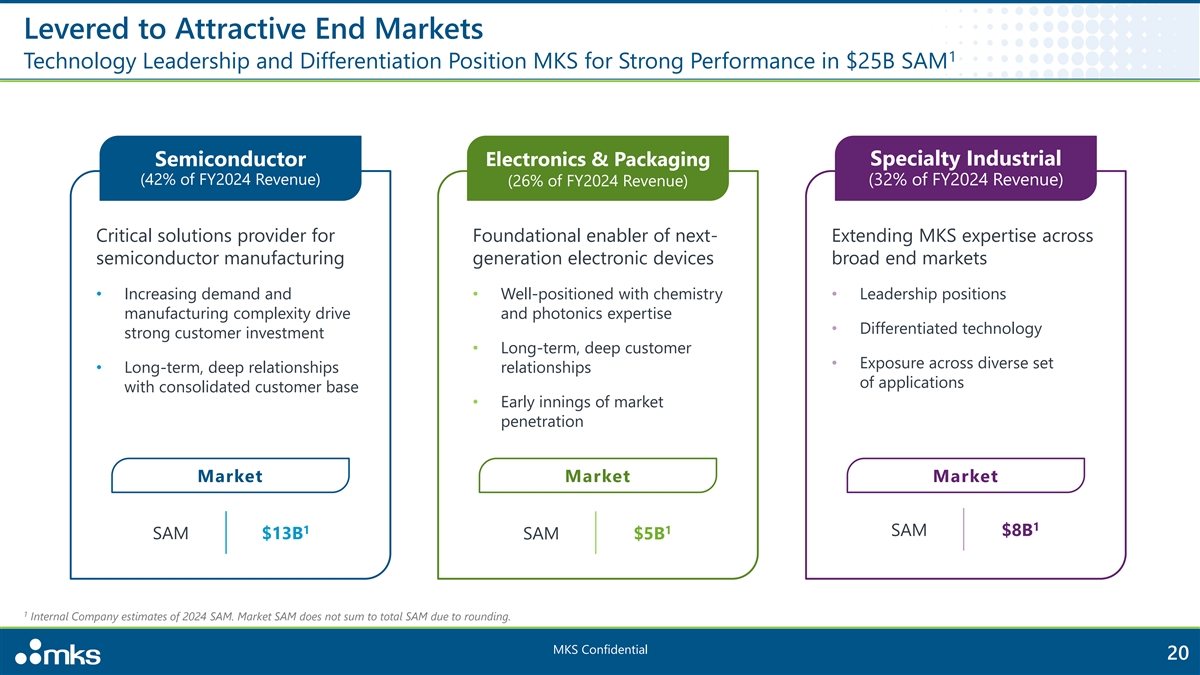 s r o t c u d % n 1 o 5 c i m e S E l e P c a t c 2 r k 0 o a n g % i i c n s g & Significant Serviceable Addressable Market (SAM) Expansion 1 1 SAM in 2015 SAM in 2024 $25B ~$6B Non- Semiconductors 25% Semiconductors 75% 1 Internal Company estimates MKS Confidential 19 l a i r t s u d n % I 9 y 2 t l a i c e p S