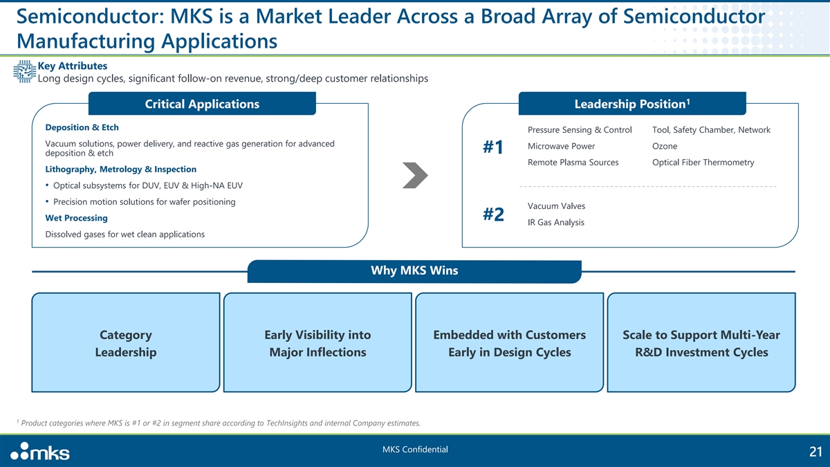 Levered to Attractive End Markets 1 Technology Leadership and Differentiation Position MKS for Strong Performance in $25B SAM Semiconductor Electronics & Packaging Specialty Industrial (42% of FY2024 Revenue) (32% of FY2024 Revenue) (26% of FY2024 Revenue) Critical solutions provider for Foundational enabler of next- Extending MKS expertise across semiconductor manufacturing generation electronic devices broad end markets • Increasing demand and • Well-positioned with chemistry • Leadership positions manufacturing complexity drive and photonics expertise • Differentiated technology strong customer investment • Long-term, deep customer • Exposure across diverse set • Long-term, deep relationships relationships of applications with consolidated customer base • Early innings of market penetration Market Market Market 1 1 1 SAM $8B SAM $13B SAM $5B 1 Internal Company estimates of 2024 SAM. Market SAM does not sum to total SAM due to rounding. MKS Confidential 20