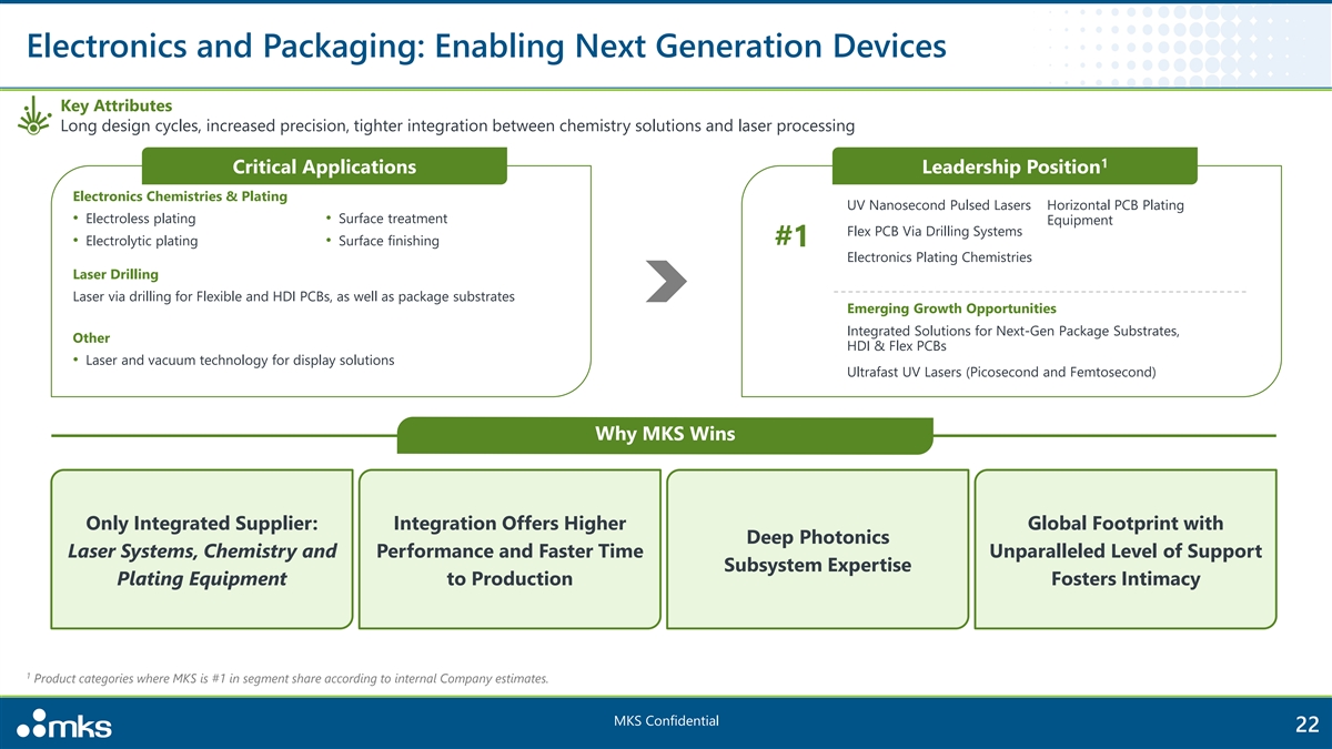 Semiconductor: MKS is a Market Leader Across a Broad Array of Semiconductor Manufacturing Applications Key Attributes Long design cycles, significant follow-on revenue, strong/deep customer relationships 1 Critical Applications Leadership Position Deposition & Etch Pressure Sensing & Control Tool, Safety Chamber, Network Vacuum solutions, power delivery, and reactive gas generation for advanced Microwave Power Ozone #1 deposition & etch Remote Plasma Sources Optical Fiber Thermometry Lithography, Metrology & Inspection • Optical subsystems for DUV, EUV & High-NA EUV • Precision motion solutions for wafer positioning Vacuum Valves Wet Processing #2 IR Gas Analysis Dissolved gases for wet clean applications Category Early Visibility into Em bedded with Customers Scale to Support Multi-Year Leadership Major Inflections Early in Design Cycles R&D Investment Cycles 1 Product categories where MKS is #1 or #2 in segment share according to TechInsights and internal Company estimates. MKS Confidential 21