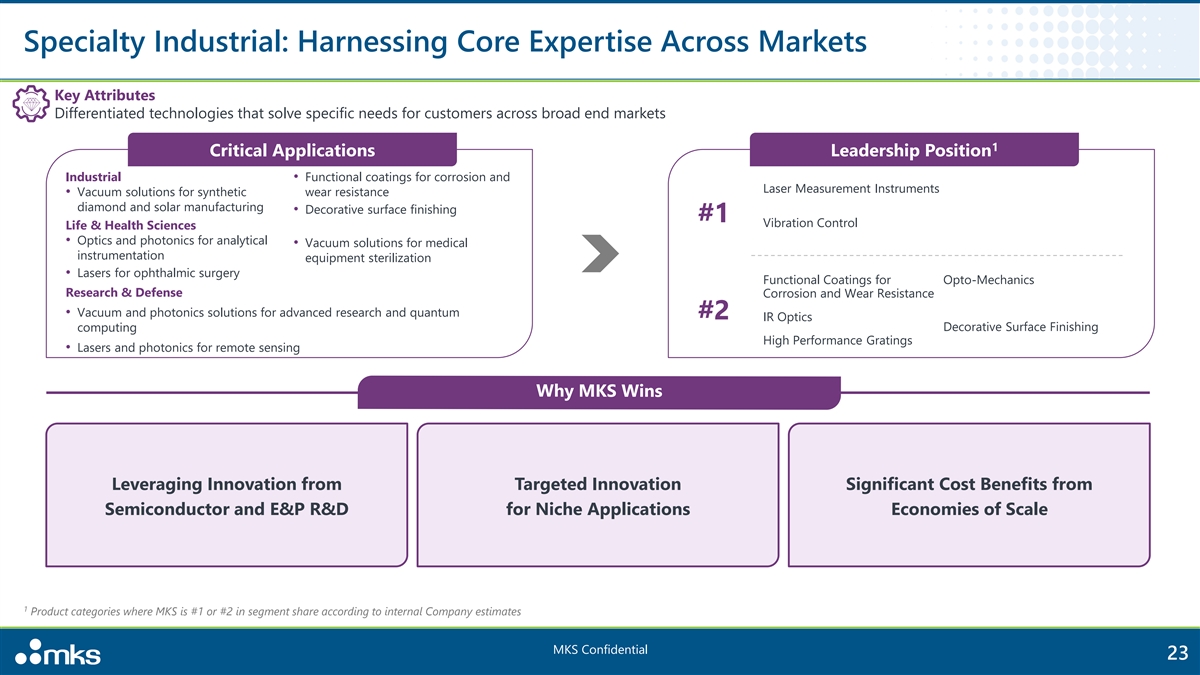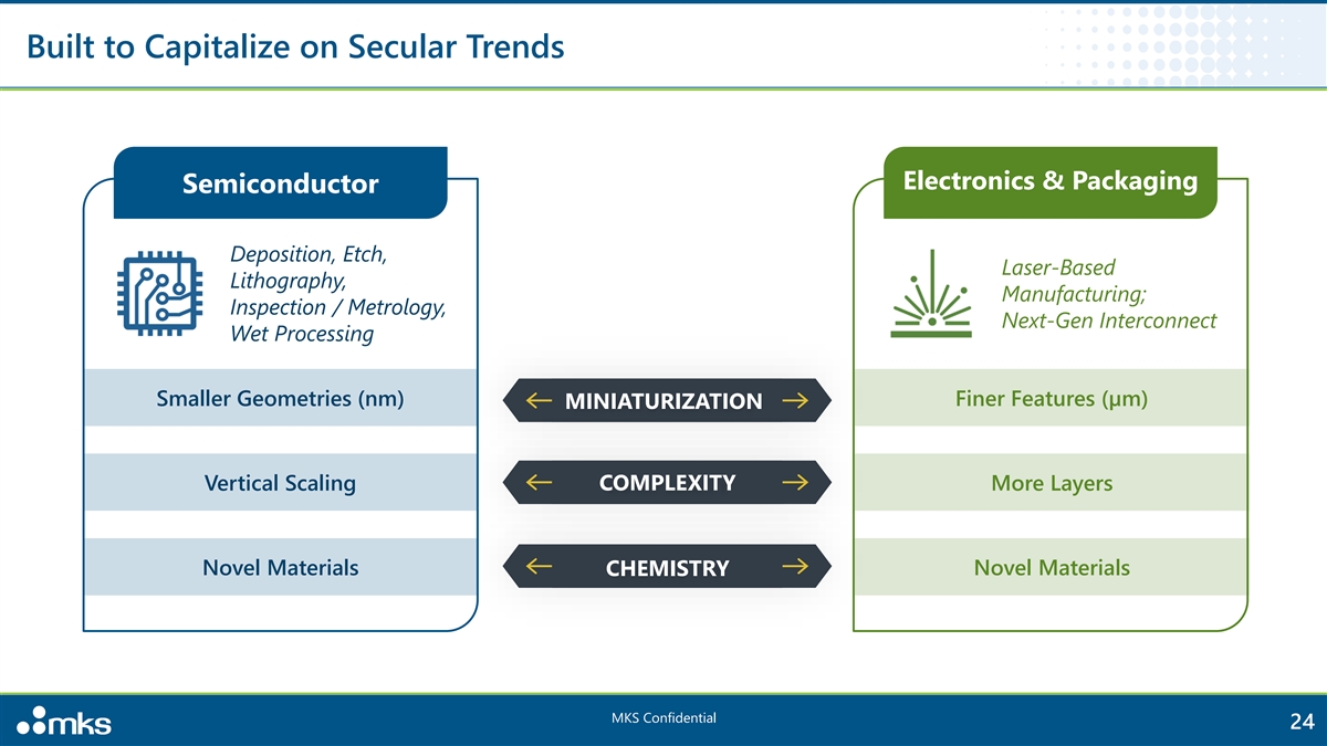 Specialty Industrial: Harnessing Core Expertise Across Markets Key Attributes Differentiated technologies that solve specific needs for customers across broad end markets 1 Critical Applications Leadership Position Industrial• Functional coatings for corrosion and Laser Measurement Instruments • Vacuum solutions for synthetic wear resistance diamond and solar manufacturing • Decorative surface finishing #1 Vibration Control Life & Health Sciences • Optics and photonics for analytical • Vacuum solutions for medical instrumentation equipment sterilization • Lasers for ophthalmic surgery Functional Coatings for Opto-Mechanics Research & Defense Corrosion and Wear Resistance • Vacuum and photonics solutions for advanced research and quantum #2 IR Optics Decorative Surface Finishing computing High Performance Gratings • Lasers and photonics for remote sensing Leveraging Innovation from Targeted Innovation S ig nificant Cost Benefits from Semiconductor and E&P R&D for Niche Applications Economies of Scale 1 Product categories where MKS is #1 or #2 in segment share according to internal Company estimates MKS Confidential 23