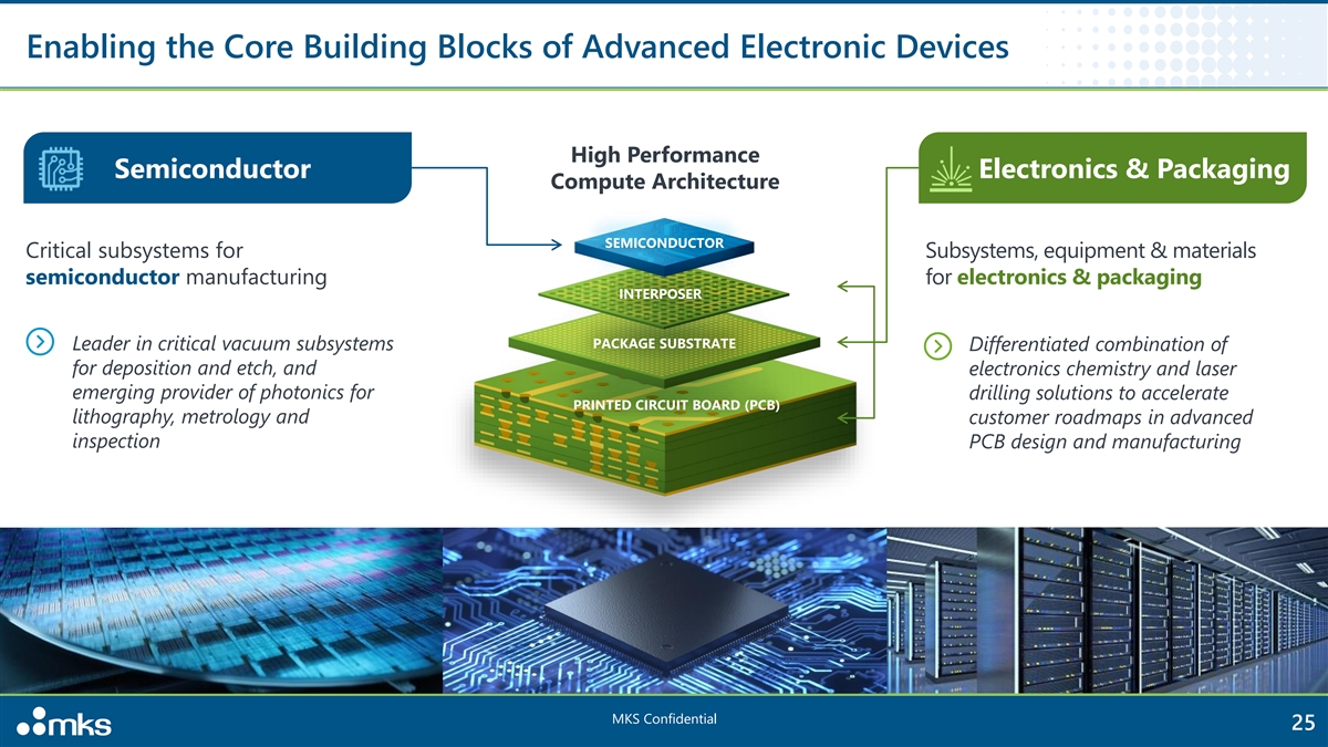 Built to Capitalize on Secular Trends Electronics & Packaging Semiconductor Deposition, Etch, Laser-Based Lithography, Manufacturing; Inspection / Metrology, Next-Gen Interconnect Wet Processing Smaller Geometries (nm) Finer Features (µm) MINIATURIZATION Vertical Scaling COMPLEXITY More Layers Novel Materials CHEMISTRY Novel Materials MKS Confidential 24