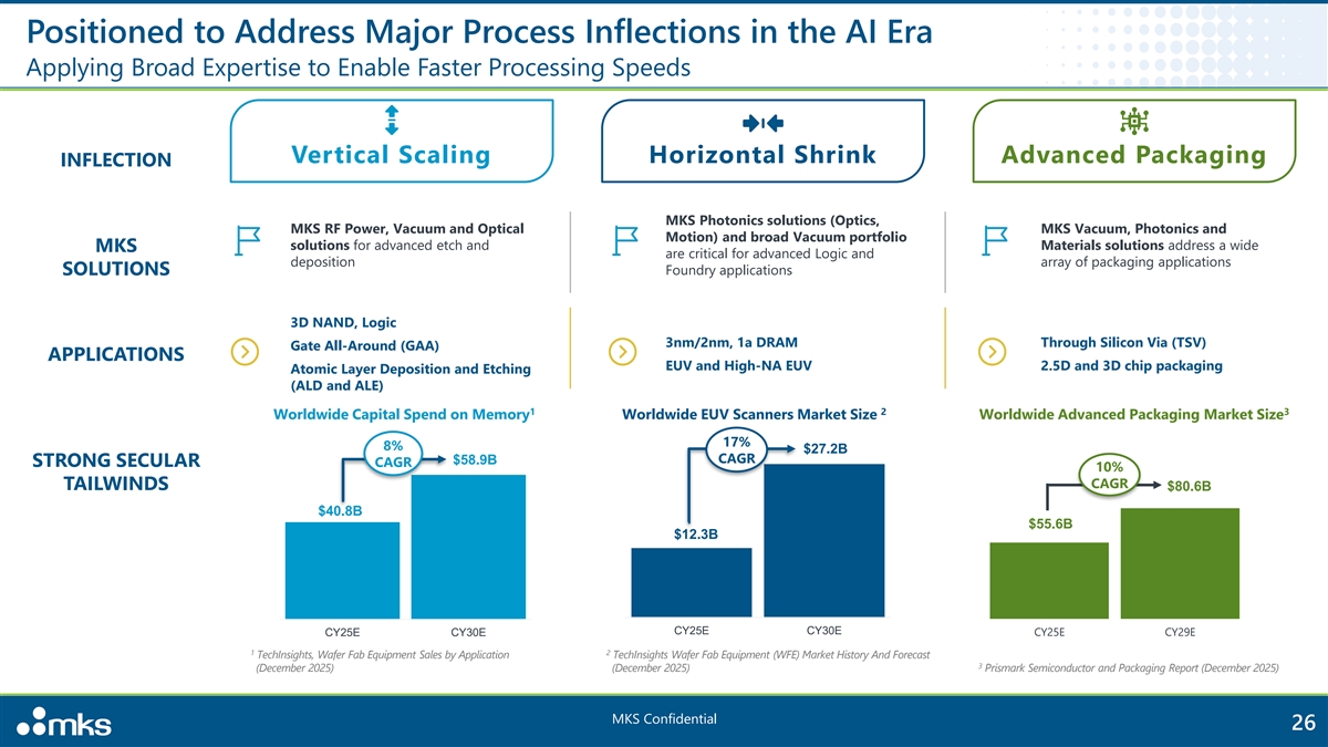 Positioned to Address Major Process Inflections in the AI Era Applying Broad Expertise to Enable Faster Processing Speeds Vertical Scaling Horizontal Shrink Advanced Packaging INFLECTION MKS Photonics solutions (Optics, MKS RF Power, Vacuum and Optical MKS Vacuum, Photonics and Motion) and broad Vacuum portfolio solutions for advanced etch and Materials solutions address a wide MKS are critical for advanced Logic and deposition array of packaging applications SOLUTIONS Foundry applications 3D NAND, Logic 3nm/2nm, 1a DRAM Through Silicon Via (TSV) Gate All-Around (GAA) APPLICATIONS EUV and High-NA EUV 2.5D and 3D chip packaging Atomic Layer Deposition and Etching (ALD and ALE) 1 2 3 Worldwide Capital Spend on Memory Worldwide EUV Scanners Market Size Worldwide Advanced Packaging Market Size 17% 8% $27.2B CAGR $58.9B STRONG SECULAR CAGR 10% CAGR TAILWINDS $80.6B $40.8B $55.6B $12.3B CY25E CY30E CY25E CY30E CY25E CY29E 1 2 TechInsights, Wafer Fab Equipment Sales by Application TechInsights Wafer Fab Equipment (WFE) Market History And Forecast 3 (December 2025) (December 2025) Prismark Semiconductor and Packaging Report (December 2025) MKS Confidential 26