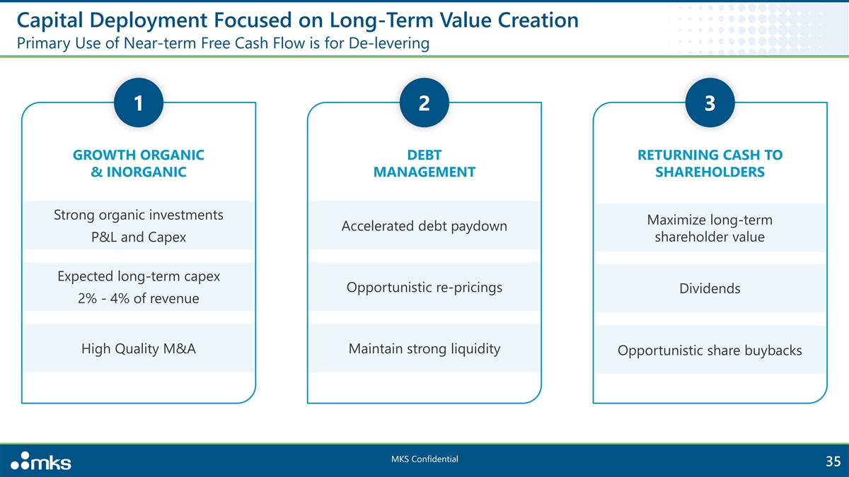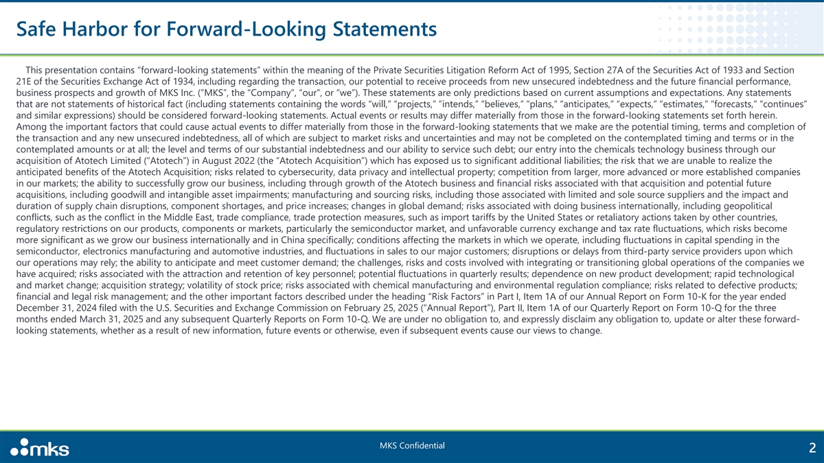 Safe Harbor for Forward-Looking Statements This presentation contains “forward-looking statements” within the meaning of the Private Securities Litigation Reform Act of 1995, Section 27A of the Securities Act of 1933 and Section 21E of the Securities Exchange Act of 1934, including regarding the transaction, our potential to receive proceeds from new unsecured indebtedness and the future financial performance, business prospects and growth of MKS Inc. (“MKS”, the “Company”, “our”, or “we”). These statements are only predictions based on current assumptions and expectations. Any statements that are not statements of historical fact (including statements containing the words “will,” “projects,” “intends,” “believes,” “plans,” “anticipates,” “expects,” “estimates,” “forecasts,” “continues” and similar expressions) should be considered forward-looking statements. Actual events or results may differ materially from those in the forward-looking statements set forth herein. Among the important factors that could cause actual events to differ materially from those in the forward-looking statements that we make are the potential timing, terms and completion of the transaction and any new unsecured indebtedness, all of which are subject to market risks and uncertainties and may not be completed on the contemplated timing and terms or in the contemplated amounts or at all; the level and terms of our substantial indebtedness and our ability to service such debt; our entry into the chemicals technology business through our acquisition of Atotech Limited (“Atotech”) in August 2022 (the “Atotech Acquisition”) which has exposed us to significant additional liabilities; the risk that we are unable to realize the anticipated benefits of the Atotech Acquisition; risks related to cybersecurity, data privacy and intellectual property; competition from larger, more advanced or more established companies in our markets; the ability to successfully grow our business, including through growth of the Atotech business and financial risks associated with that acquisition and potential future acquisitions, including goodwill and intangible asset impairments; manufacturing and sourcing risks, including those associated with limited and sole source suppliers and the impact and duration of supply chain disruptions, component shortages, and price increases; changes in global demand; risks associated with doing business internationally, including geopolitical conflicts, such as the conflict in the Middle East, trade compliance, trade protection measures, such as import tariffs by the United States or retaliatory actions taken by other countries, regulatory restrictions on our products, components or markets, particularly the semiconductor market, and unfavorable currency exchange and tax rate fluctuations, which risks become more significant as we grow our business internationally and in China specifically; conditions affecting the markets in which we operate, including fluctuations in capital spending in the semiconductor, electronics manufacturing and automotive industries, and fluctuations in sales to our major customers; disruptions or delays from third-party service providers upon which our operations may rely; the ability to anticipate and meet customer demand; the challenges, risks and costs involved with integrating or transitioning global operations of the companies we have acquired; risks associated with the attraction and retention of key personnel; potential fluctuations in quarterly results; dependence on new product development; rapid technological and market change; acquisition strategy; volatility of stock price; risks associated with chemical manufacturing and environmental regulation compliance; risks related to defective products; financial and legal risk management; and the other important factors described under the heading “Risk Factors” in Part I, Item 1A of our Annual Report on Form 10-K for the year ended December 31, 2024 filed with the U.S. Securities and Exchange Commission on February 25, 2025 (“Annual Report”), Part II, Item 1A of our Quarterly Report on Form 10-Q for the three months ended March 31, 2025 and any subsequent Quarterly Reports on Form 10-Q. We are under no obligation to, and expressly disclaim any obligation to, update or alter these forward- looking statements, whether as a result of new information, future events or otherwise, even if subsequent events cause our views to change. MKS Confidential 2
