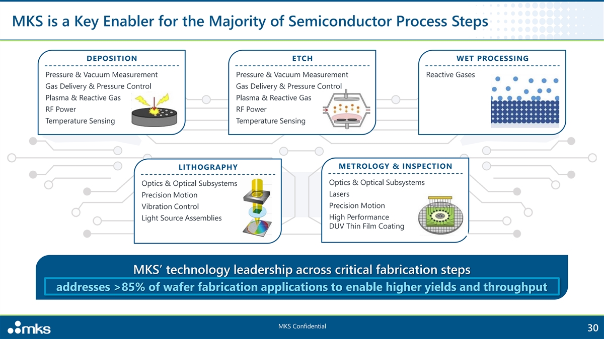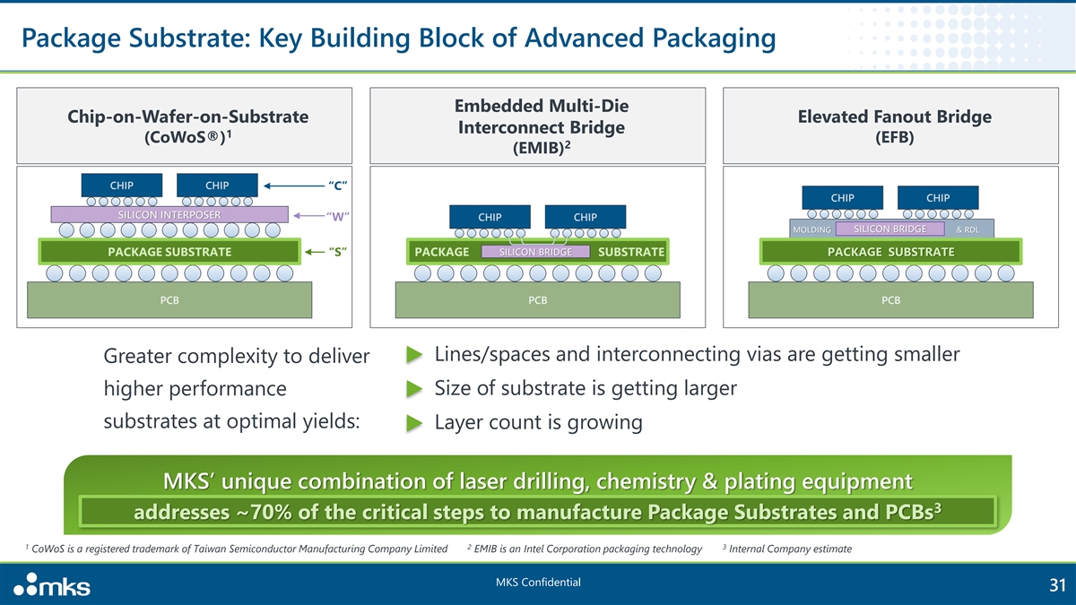 MKS is a Key Enabler for the Majority of Semiconductor Process Steps DEPOSITION ETCH WET PROCESSING Pressure & Vacuum Measurement Pressure & Vacuum Measurement Reactive Gases Gas Delivery & Pressure Control Gas Delivery & Pressure Control Plasma & Reactive Gas Plasma & Reactive Gas RF Power RF Power Temperature Sensing Temperature Sensing METROLOGY & INSPECTION LITHOGRAPHY Optics & Optical Subsystems Optics & Optical Subsystems Lasers Precision Motion Precision Motion Vibration Control High Performance Light Source Assemblies DUV Thin Film Coating MKS’ technology leadership across critical fabrication steps >70% of the critical steps to manufacture Package Substrates addresses >85% of wafer fabrication applications to enable higher yields and throughput MKS Confidential 30