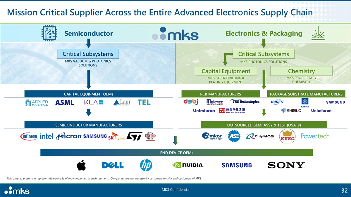 Mission Critical Supplier Across the Entire Advanced Electronics Supply Chain Semiconductor Electronics & Packaging Critical Subsystems Critical Subsystems MKS VACUUM & PHOTONICS MKS PHOTONICS SOLUTIONS SOLUTIONS Capital Equipment Chemistry MKS LASER DRILLING & MKS PROPRIETARY CHEMISTRY PLATING EQUIPMENT CAPITAL EQUIPMENT OEMs PCB MANUFACTURERS PACKAGE SUBSTRATE MANUFACTURERS SEMICONDUCTOR MANUFACTURERS OUTSOURCED SEMI ASSY & TEST (OSATs) END DEVICE OEMs This graphic presents a representative sample of top companies in each segment. Companies are not necessarily customers and/or end-customers of MKS. MKS Confidential 32