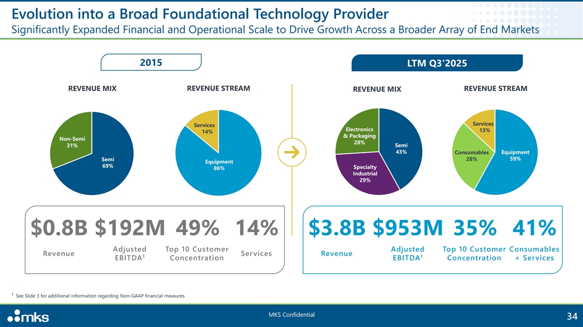 Evolution into a Broad Foundational Technology Provider Significantly Expanded Financial and Operational Scale to Drive Growth Across a Broader Array of End Markets 2015 LTM Q3'2025 REVENUE MIX REVENUE STREAM REVENUE STREAM REVENUE MIX Services Services Electronics 13% 14% & Packaging Non-Semi 28% 31% Semi 43% Consumables Equipment 59% Semi 28% Equipment Specialty 69% Specialty 86% Industrial Industrial 29% $0.8B $192M 49% 14% $3.8B $953M 35% 41% Adjusted Top 10 Customer Adjusted Top 10 Customer Consumables Revenue Services Revenue 1 1 EBITDA Concentration EBITDA Concentration + Services 1 See Slide 3 for additional information regarding Non-GAAP financial measures MKS Confidential 34