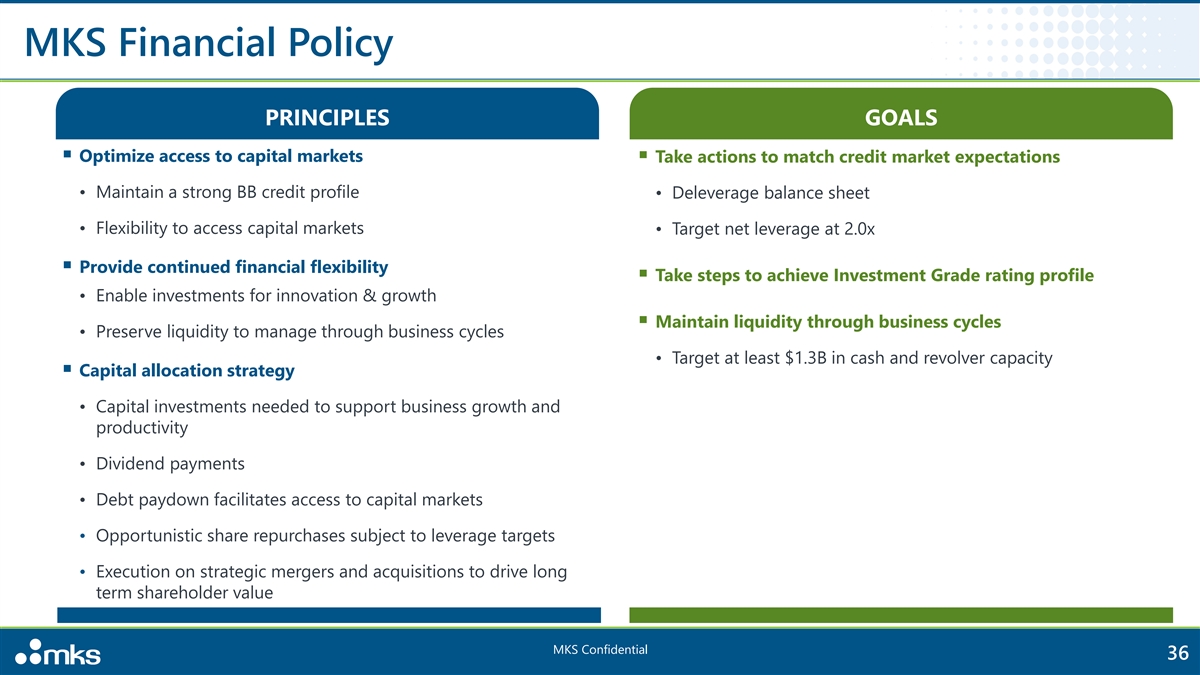 Capital Deployment Focused on Long-Term Value Creation Primary Use of Near-term Free Cash Flow is for De-levering 1 2 3 GROWTH ORGANIC DEBT RETURNING CASH TO & INORGANIC MANAGEMENT SHAREHOLDERS Strong organic investments Maximize long-term Accelerated debt paydown P&L and Capex shareholder value Expected long-term capex Opportunistic re-pricings Dividends 2% - 4% of revenue High Quality M&A Maintain strong liquidity Opportunistic share buybacks MKS Confidential 35