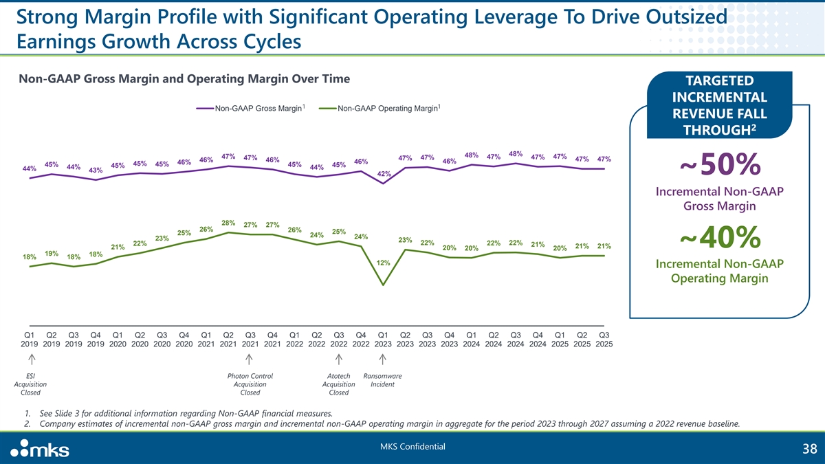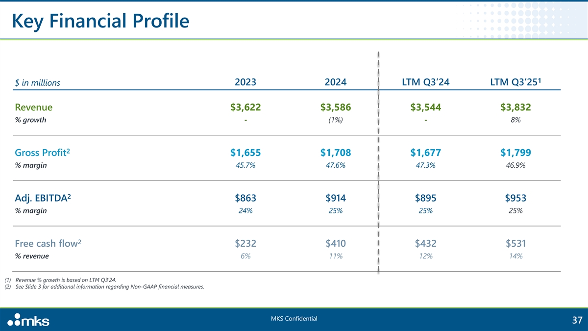 Key Financial Profile 1 2023 2024 LTM Q3’24 LTM Q3’25 $ in millions Revenue $3,622 $3,586 $3,544 $3,832 % growth - (1%) - 8% 2 Gross Profit $1,655 $1,708 $1,677 $1,799 % margin 45.7% 47.6% 47.3% 46.9% 2 Adj. EBITDA $863 $914 $895 $953 % margin 24% 25% 25% 25% 2 Free cash flow $232 $410 $432 $531 % revenue 6% 11% 12% 14% (1) Revenue % growth is based on LTM Q3’24. (2) See Slide 3 for additional information regarding Non-GAAP financial measures. MKS Confidential 37
