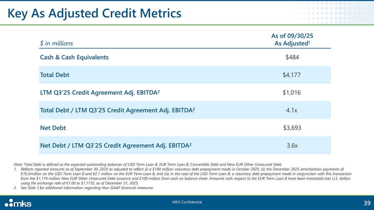 Key As Adjusted Credit Metrics As of 09/30/25 1 $ in millions As Adjusted Cash & Cash Equivalents $484 Total Debt $4,177 2 LTM Q3’25 Credit Agreement Adj. EBITDA $1,016 2 Total Debt / LTM Q3’25 Credit Agreement Adj. EBITDA 4.1x Net Debt $3,693 2 Net Debt / LTM Q3’25 Credit Agreement Adj. EBITDA 3.6x Note: Total Debt is defined as the expected outstanding balances of USD Term Loan B, EUR Term Loan B, Convertible Debt and New EUR Other Unsecured Debt. 1. Reflects reported amounts as of September 30, 2025 as adjusted to reflect (i) a $100 million voluntary debt prepayment made in October 2025, (ii) the December 2025 amortization payments of $10.2million on the USD Term Loan B and €2.1 million on the EUR Term Loan B, and (iii) in the case of the USD Term Loan B, a voluntary debt prepayment made in conjunction with this transaction from the $1,174 million New EUR Other Unsecured Debt issuance and $100 million from cash on balance sheet. Amounts with respect to the EUR Term Loan B have been translated into U.S. dollars using the exchange rate of €1.00 to $1.1735, as of December 31, 2025. 2. See Slide 3 for additional information regarding Non-GAAP financial measures. MKS Confidential 39