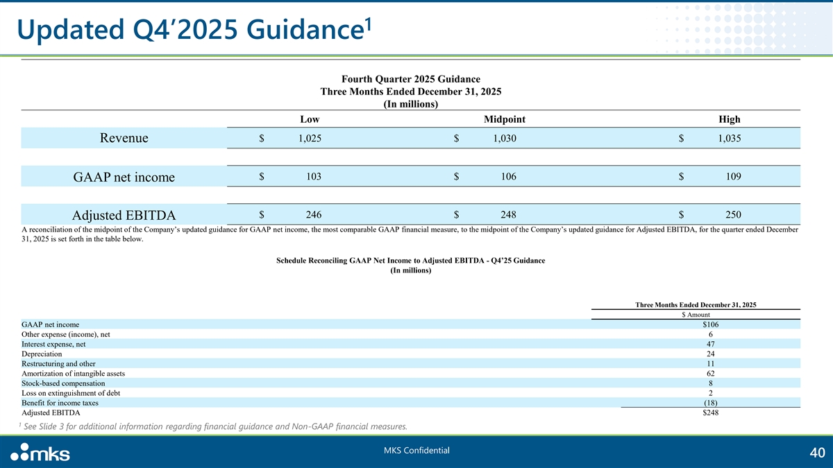 1 Updated Q4’2025 Guidance Fourth Quarter 2025 Guidance Three Months Ended December 31, 2025 (In millions) Low Midpoint High Revenue $ 1,025 $ 1,030 $ 1,035 $ 103 $ 106 $ 109 GAAP net income $ 246 $ 248 $ 250 Adjusted EBITDA A reconciliation of the midpoint of the Company’s updated guidance for GAAP net income, the most comparable GAAP financial measure, to the midpoint of the Company’s updated guidance for Adjusted EBITDA, for the quarter ended December 31, 2025 is set forth in the table below. Schedule Reconciling GAAP Net Income to Adjusted EBITDA - Q4’25 Guidance (In millions) Three Months Ended December 31, 2025 $ Amount GAAP net income $106 Other expense (income), net 6 Interest expense, net 47 Depreciation 24 Restructuring and other 11 Amortization of intangible assets 62 Stock-based compensation 8 Loss on extinguishment of debt 2 Benefit for income taxes (18) Adjusted EBITDA $248 1 See Slide 3 for additional information regarding financial guidance and Non-GAAP financial measures. MKS Confidential 40