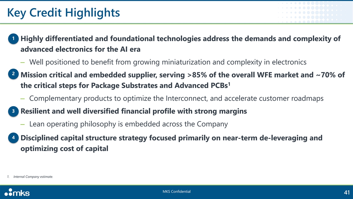 Key Credit Highlights 1 1. Highly differentiated and foundational technologies address the demands and complexity of advanced electronics for the AI era ‒ Well positioned to benefit from growing miniaturization and complexity in electronics 2 2. Mission critical and embedded supplier, serving >85% of the overall WFE market and ~70% of 1 the critical steps for Package Substrates and Advanced PCBs ‒ Complementary products to optimize the Interconnect, and accelerate customer roadmaps 3 3. Resilient and well diversified financial profile with strong margins ‒ Lean operating philosophy is embedded across the Company 4 4. Disciplined capital structure strategy focused primarily on near-term de-leveraging and optimizing cost of capital 1. Internal Company estimate. MKS Confidential 41
