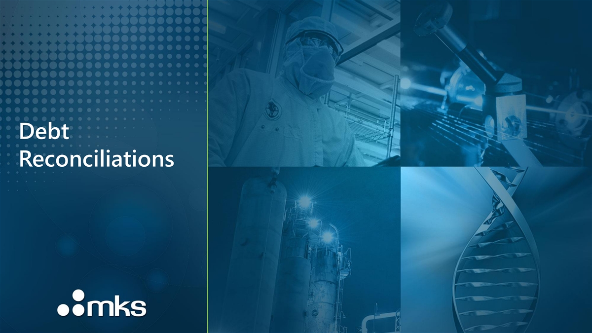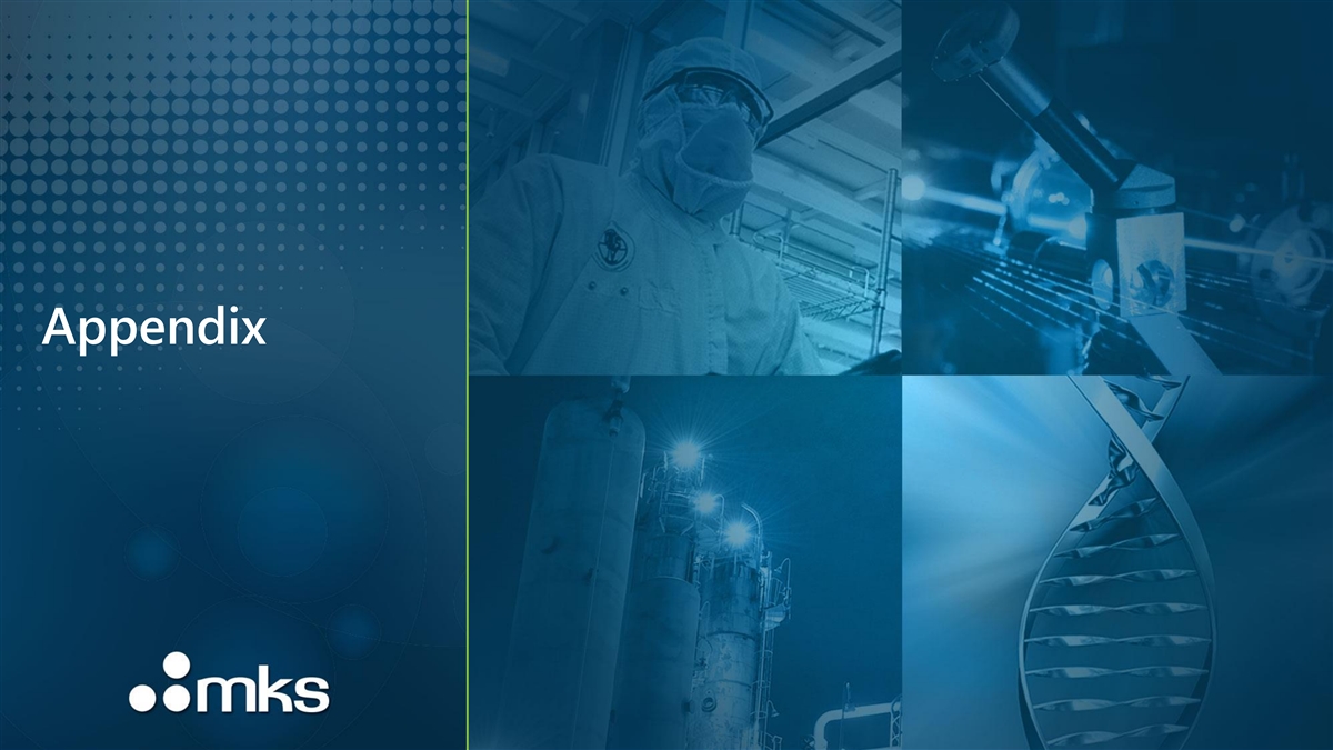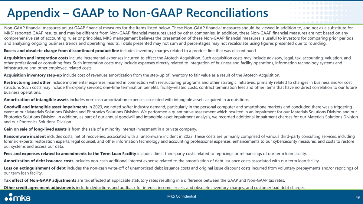 Appendix – GAAP to Non-GAAP Reconciliations Non-GAAP financial measures adjust GAAP financial measures for the items listed below. These Non-GAAP financial measures should be viewed in addition to, and not as a substitute for, MKS’ reported GAAP results, and may be different from Non-GAAP financial measures used by other companies. In addition, these Non-GAAP financial measures are not based on any comprehensive set of accounting rules or principles. MKS management believes the presentation of these Non-GAAP financial measures is useful to investors for comparing prior periods and analyzing ongoing business trends and operating results. Totals presented may not sum and percentages may not recalculate using figures presented due to rounding. Excess and obsolete charge from discontinued product line includes inventory charges related to a product line that was discontinued. Acquisition and integration costs include incremental expenses incurred to effect the Atotech Acquisition. Such acquisition costs may include advisory, legal, tax, accounting, valuation, and other professional or consulting fees. Such integration costs may include expenses directly related to integration of business and facility operations, information technology systems and infrastructure and other employee-related costs. Acquisition inventory step-up include cost of revenues amortization from the step-up of inventory to fair value as a result of the Atotech Acquisition. Restructuring and other include incremental expenses incurred in connection with restructuring programs and other strategic initiatives, primarily related to changes in business and/or cost structure. Such costs may include third-party services, one-time termination benefits, facility-related costs, contract termination fees and other items that have no direct correlation to our future business operations. Amortization of intangible assets includes non-cash amortization expense associated with intangible assets acquired in acquisitions. Goodwill and intangible asset impairments In 2023, we noted softer industry demand, particularly in the personal computer and smartphone markets and concluded there was a triggering event at our Materials Solutions Division and Photonics Solutions Division. We performed a quantitative assessment which resulted in an impairment for our Materials Solutions Division and our Photonics Solutions Division. In addition, as part of our annual goodwill and intangible asset impairment analysis, we recorded additional impairment charges for our Materials Solutions Division and our Photonics Solutions Division. Gain on sale of long-lived assets is from the sale of a minority interest investment in a private company. Ransomware incident includes costs, net of recoveries, associated with a ransomware incident in 2023. These costs are primarily comprised of various third-party consulting services, including forensic experts, restoration experts, legal counsel, and other information technology and accounting professional expenses, enhancements to our cybersecurity measures, and costs to restore our systems and access our data. Fees and expenses related to amendments to the Term Loan Facility includes direct third-party costs related to repricings or refinancings of our term loan facility. Amortization of debt issuance costs includes non-cash additional interest expense related to the amortization of debt issuance costs associated with our term loan facility. Loss on extinguishment of debt includes the non-cash write-off of unamortized debt issuance costs and original issue discount costs incurred from voluntary prepayments and/or repricings of our term loan facility. Tax effect of Non-GAAP adjustments are tax effected at applicable statutory rates resulting in a difference between the GAAP and Non-GAAP tax rates. Other credit agreement adjustments include deductions and addback for interest income, excess and obsolete inventory charges, and customer bad debt charges. MKS Confidential 49