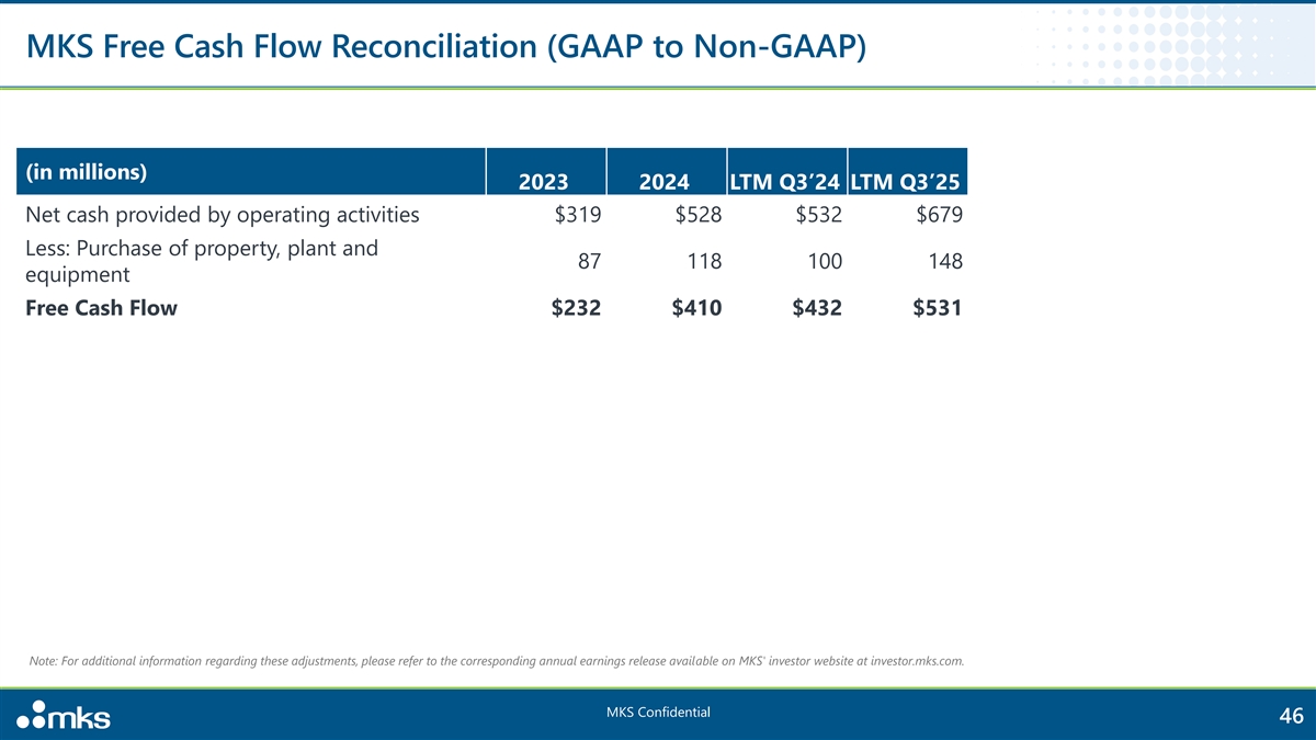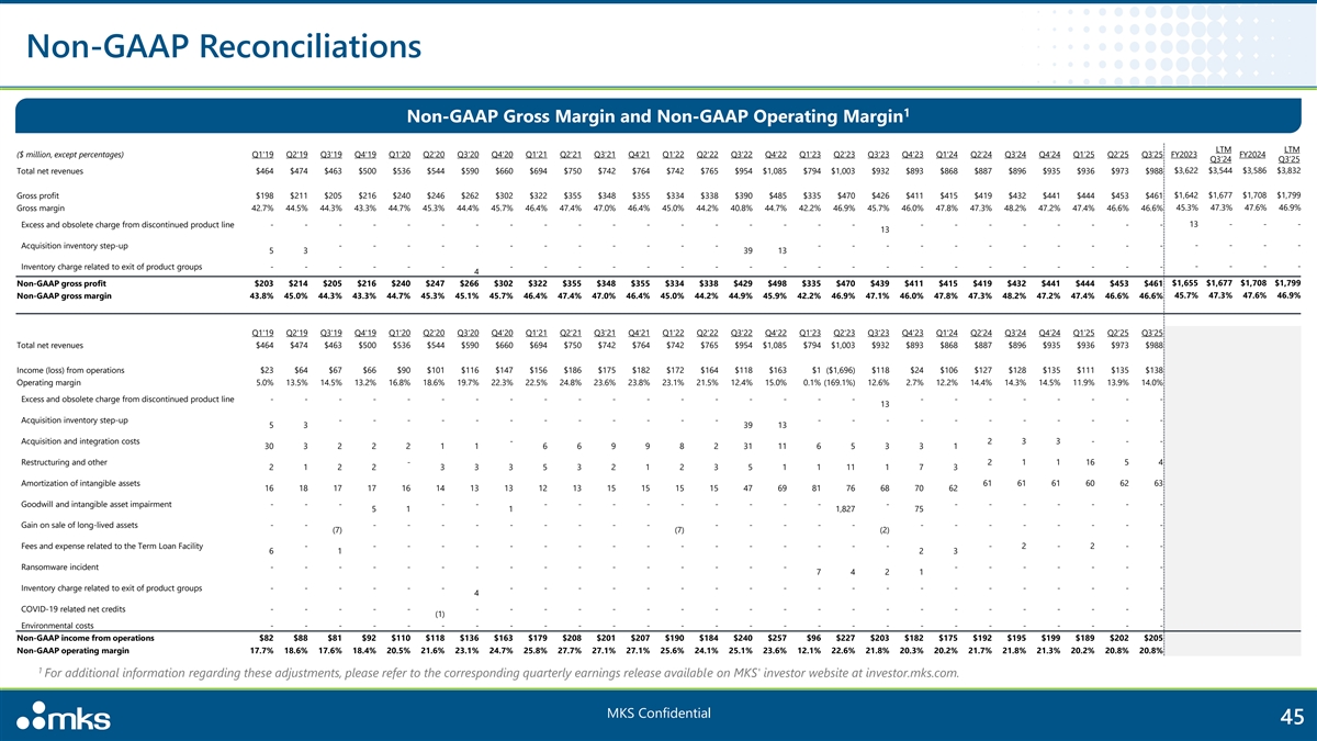 Non-GAAP Reconciliations 1 Non-GAAP Gross Margin and Non-GAAP Operating Margin LTM LTM ($ million, except percentages) Q1'19 Q2'19 Q3'19 Q4'19 Q1'20 Q2'20 Q3'20 Q4'20 Q1'21 Q2'21 Q3'21 Q4'21 Q1'22 Q2'22 Q3'22 Q4'22 Q1'23 Q2'23 Q3'23 Q4'23 Q1'24 Q2’24 Q3’24 Q4’24 Q1’25 Q2’25 Q3’25 FY2023 FY2024 Q3’24 Q3’25 Total net revenues $464 $474 $463 $500 $536 $544 $590 $660 $694 $750 $742 $764 $742 $765 $954 $1,085 $794 $1,003 $932 $893 $868 $887 $896 $935 $936 $973 $988 $3,622 $3,544 $3,586 $3,832 $1,642 $1,677 $1,708 $1,799 Gross profit $198 $211 $205 $216 $240 $246 $262 $302 $322 $355 $348 $355 $334 $338 $390 $485 $335 $470 $426 $411 $415 $419 $432 $441 $444 $453 $461 45.3% 47.3% 47.6% 46.9% Gross margin 42.7% 44.5% 44.3% 43.3% 44.7% 45.3% 44.4% 45.7% 46.4% 47.4% 47.0% 46.4% 45.0% 44.2% 40.8% 44.7% 42.2% 46.9% 45.7% 46.0% 47.8% 47.3% 48.2% 47.2% 47.4% 46.6% 46.6% Excess and obsolete charge from discontinued product line - - - - - - - - - - - - - - - - - - - - - - - - - - 13 - - - 13 Acquisition inventory step-up - - - - - - - - - - - - - - - - - - - - - - - - - - - 5 3 39 13 - - - - Inventory charge related to exit of product groups - - - - - - - - - - - - - - - - - - - - - - - - - - 4 $1,655 $1,677 $1,708 $1,799 Non-GAAP gross profit $203 $214 $205 $216 $240 $247 $266 $302 $322 $355 $348 $355 $334 $338 $429 $498 $335 $470 $439 $411 $415 $419 $432 $441 $444 $453 $461 45.7% 47.3% 47.6% 46.9% Non-GAAP gross margin 43.8% 45.0% 44.3% 43.3% 44.7% 45.3% 45.1% 45.7% 46.4% 47.4% 47.0% 46.4% 45.0% 44.2% 44.9% 45.9% 42.2% 46.9% 47.1% 46.0% 47.8% 47.3% 48.2% 47.2% 47.4% 46.6% 46.6% Q1'19 Q2'19 Q3'19 Q4'19 Q1'20 Q2'20 Q3'20 Q4'20 Q1'21 Q2'21 Q3'21 Q4'21 Q1'22 Q2'22 Q3'22 Q4'22 Q1'23 Q2'23 Q3'23 Q4'23 Q1'24 Q2’24 Q3’24 Q4’24 Q1’25 Q2’25 Q3’25 Total net revenues $464 $474 $463 $500 $536 $544 $590 $660 $694 $750 $742 $764 $742 $765 $954 $1,085 $794 $1,003 $932 $893 $868 $887 $896 $935 $936 $973 $988 Income (loss) from operations $23 $64 $67 $66 $90 $101 $116 $147 $156 $186 $175 $182 $172 $164 $118 $163 $1 ($1,696) $118 $24 $106 $127 $128 $135 $111 $135 $138 Operating margin 5.0% 13.5% 14.5% 13.2% 16.8% 18.6% 19.7% 22.3% 22.5% 24.8% 23.6% 23.8% 23.1% 21.5% 12.4% 15.0% 0.1% (169.1%) 12.6% 2.7% 12.2% 14.4% 14.3% 14.5% 11.9% 13.9% 14.0% Excess and obsolete charge from discontinued product line - - - - - - - - - - - - - - - - - - - - - - - - - - 13 Acquisition inventory step-up - - - - - - - - - - - - - - - - - - - - - - - 5 3 39 13 Acquisition and integration costs - 2 3 3 - - - 30 3 2 2 2 1 1 6 6 9 9 8 2 31 11 6 5 3 3 1 Restructuring and other - 2 1 1 16 5 4 2 1 2 2 3 3 3 5 3 2 1 2 3 5 1 1 11 1 7 3 Amortization of intangible assets 61 61 61 60 62 63 16 18 17 17 16 14 13 13 12 13 15 15 15 15 47 69 81 76 68 70 62 Goodwill and intangible asset impairment - - - - - - - - - - - - - - - - - - - - - - 5 1 1 1,827 75 Gain on sale of long-lived assets - - - - - - - - - - - - - - - - - - - - - - - - (7) (7) (2) Fees and expense related to the Term Loan Facility - - - - - - - - - - - - - - - - - - 2 - 2 - - 6 1 2 3 Ransomware incident - - - - - - - - - - - - - - - - - - - - - - - 7 4 2 1 Inventory charge related to exit of product groups - - - - - - - - - - - - - - - - - - - - - - - - - - 4 COVID-19 related net credits - - - - - - - - - - - - - - - - - - - - - - - - - - (1) Environmental costs - - - - - - - - - - - - - - - - - - - - - - - - - - - Non-GAAP income from operations $82 $88 $81 $92 $110 $118 $136 $163 $179 $208 $201 $207 $190 $184 $240 $257 $96 $227 $203 $182 $175 $192 $195 $199 $189 $202 $205 Non-GAAP operating margin 17.7% 18.6% 17.6% 18.4% 20.5% 21.6% 23.1% 24.7% 25.8% 27.7% 27.1% 27.1% 25.6% 24.1% 25.1% 23.6% 12.1% 22.6% 21.8% 20.3% 20.2% 21.7% 21.8% 21.3% 20.2% 20.8% 20.8% 1 For additional information regarding these adjustments, please refer to the corresponding quarterly earnings release available on MKS' investor website at investor.mks.com. MKS Confidential 45