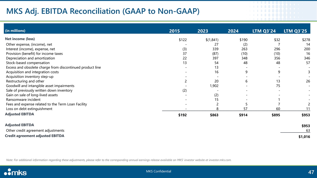 MKS Free Cash Flow Reconciliation (GAAP to Non-GAAP) (in millions) 2023 2024 LTM Q3’24 LTM Q3’25 Net cash provided by operating activities $319 $528 $532 $679 Less: Purchase of property, plant and 87 118 100 148 equipment Free Cash Flow $232 $410 $432 $531 Note: For additional information regarding these adjustments, please refer to the corresponding annual earnings release available on MKS' investor website at investor.mks.com. MKS Confidential 46