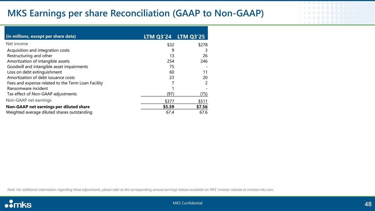 MKS Earnings per share Reconciliation (GAAP to Non-GAAP) (in millions, except per share data) LTM Q3’24 LTM Q3’25 Net income $32 $278 Acquisition and integration costs 9 3 Restructuring and other 13 26 Amortization of intangible assets 254 246 Goodwill and intangible asset impairments 75 - Loss on debt extinguishment 60 11 Amortization of debt issuance costs 23 20 Fees and expense related to the Term Loan Facility 7 2 Ransomware incident 1 - Tax effect of Non-GAAP adjustments (97) (75) Non-GAAP net earnings $377 $511 Non-GAAP net earnings per diluted share $5.59 $7.56 Weighted average diluted shares outstanding 67.4 67.6 Note: For additional information regarding these adjustments, please refer to the corresponding annual earnings release available on MKS' investor website at investor.mks.com. MKS Confidential 48