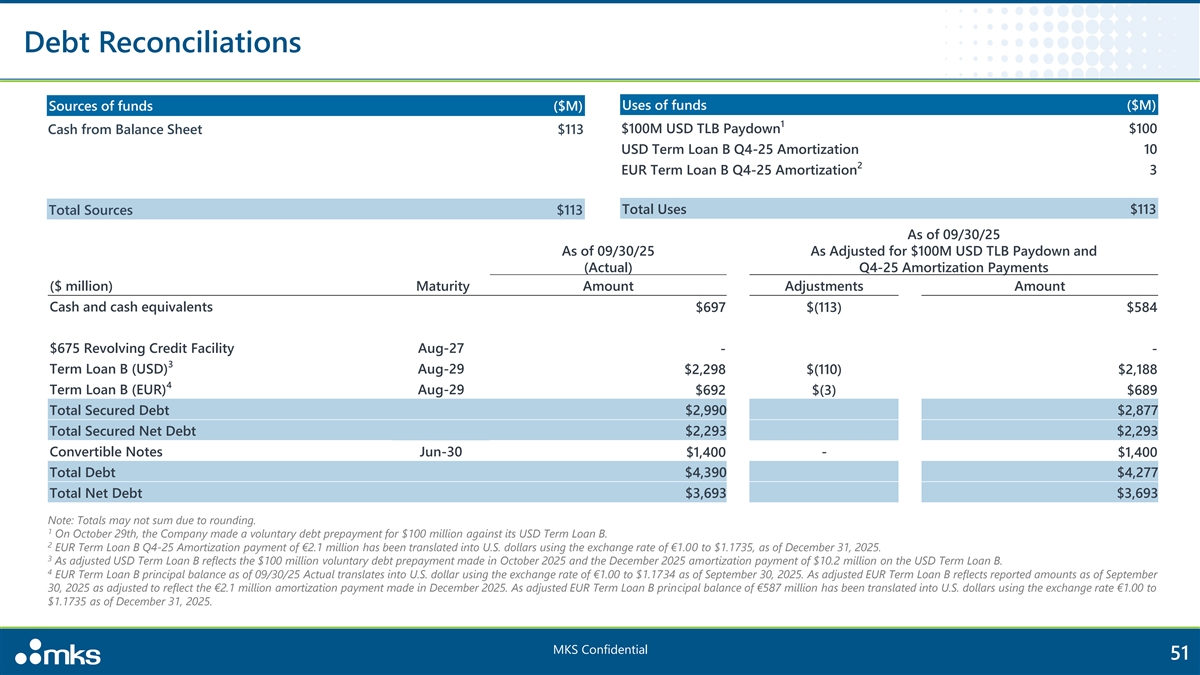 Debt Reconciliations Uses of funds ($M) Sources of funds ($M) 1 Cash from Balance Sheet $113 $100M USD TLB Paydown $100 USD Term Loan B Q4-25 Amortization 10 2 EUR Term Loan B Q4-25 Amortization 3 Total Uses $113 Total Sources $113 As of 09/30/25 As of 09/30/25 As Adjusted for $100M USD TLB Paydown and (Actual) Q4-25 Amortization Payments ($ million) Maturity Amount Adjustments Amount Cash and cash equivalents $697 $(113) $584 $675 Revolving Credit Facility Aug-27 - - 3 Term Loan B (USD) Aug-29 $2,298 $(110) $2,188 4 Term Loan B (EUR) Aug-29 $692 $(3) $689 Total Secured Debt $2,990 $2,877 Total Secured Net Debt $2,293 $2,293 Convertible Notes Jun-30 - $1,400 $1,400 Total Debt $4,390 $4,277 Total Net Debt $3,693 $3,693 Note: Totals may not sum due to rounding. 1 On October 29th, the Company made a voluntary debt prepayment for $100 million against its USD Term Loan B. 2 EUR Term Loan B Q4-25 Amortization payment of €2.1 million has been translated into U.S. dollars using the exchange rate of €1.00 to $1.1735, as of December 31, 2025. 3 As adjusted USD Term Loan B reflects the $100 million voluntary debt prepayment made in October 2025 and the December 2025 amortization payment of $10.2 million on the USD Term Loan B. 4 EUR Term Loan B principal balance as of 09/30/25 Actual translates into U.S. dollar using the exchange rate of €1.00 to $1.1734 as of September 30, 2025. As adjusted EUR Term Loan B reflects reported amounts as of September 30, 2025 as adjusted to reflect the €2.1 million amortization payment made in December 2025. As adjusted EUR Term Loan B principal balance of €587 million has been translated into U.S. dollars using the exchange rate €1.00 to $1.1735 as of December 31, 2025. MKS Confidential 51