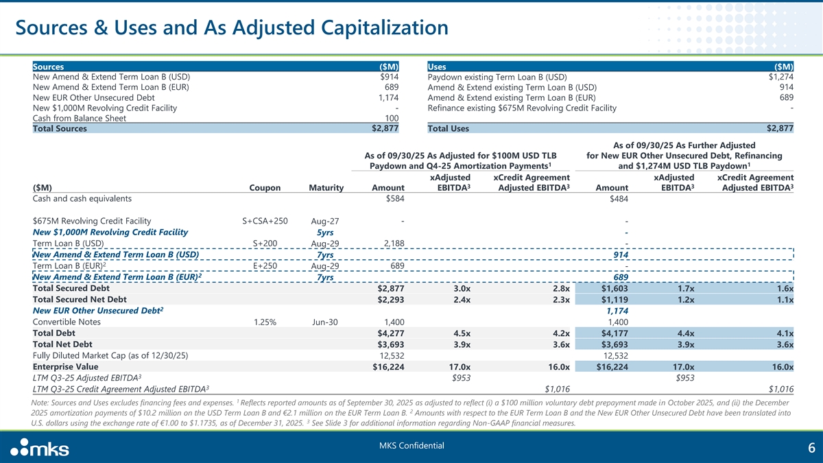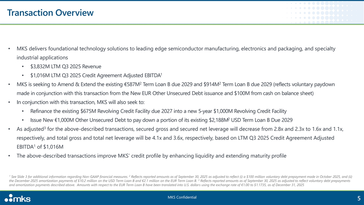 Transaction Overview • MKS delivers foundational technology solutions to leading edge semiconductor manufacturing, electronics and packaging, and specialty industrial applications • $3,832M LTM Q3 2025 Revenue 1 • $1,016M LTM Q3 2025 Credit Agreement Adjusted EBITDA 2 2 • MKS is seeking to Amend & Extend the existing €587M Term Loan B due 2029 and $914M Term Loan B due 2029 (reflects voluntary paydown made in conjunction with this transaction from the New EUR Other Unsecured Debt issuance and $100M from cash on balance sheet) • In conjunction with this transaction, MKS will also seek to: • Refinance the existing $675M Revolving Credit Facility due 2027 into a new 5-year $1,000M Revolving Credit Facility 2 • Issue New €1,000M Other Unsecured Debt to pay down a portion of its existing $2,188M USD Term Loan B Due 2029 3 • As adjusted for the above-described transactions, secured gross and secured net leverage will decrease from 2.8x and 2.3x to 1.6x and 1.1x, respectively, and total gross and total net leverage will be 4.1x and 3.6x, respectively, based on LTM Q3 2025 Credit Agreement Adjusted 1 EBITDA of $1,016M • The above-described transactions improve MKS’ credit profile by enhancing liquidity and extending maturity profile 1 2 See Slide 3 for additional information regarding Non-GAAP financial measures. Reflects reported amounts as of September 30, 2025 as adjusted to reflect (i) a $100 million voluntary debt prepayment made in October 2025, and (ii) 3 the December 2025 amortization payments of $10.2 million on the USD Term Loan B and €2.1 million on the EUR Term Loan B. Reflects reported amounts as of September 30, 2025 as adjusted to reflect voluntary debt prepayments and amortization payments described above. Amounts with respect to the EUR Term Loan B have been translated into U.S. dollars using the exchange rate of €1.00 to $1.1735, as of December 31, 2025 MKS Confidential 5 1 Note: Sources and Uses excludes financing fees and expenses. Reflects reported amounts as of September 30, 2025 as adjusted to reflect (i) a $100 million voluntary debt prepayment made in October 2025, and (ii) the December 2 2025 amortization payments of $10.2 million on the USD Term Loan B and €2.1 million on the EUR Term Loan B. Amounts with respect to the EUR Term Loan B have been translated into U.S. dollars using the exchange rate of 3 €1.00 to $1.1735, as of December 31, 2025. See Slide 3 for additional information regarding Non-GAAP financial measures.