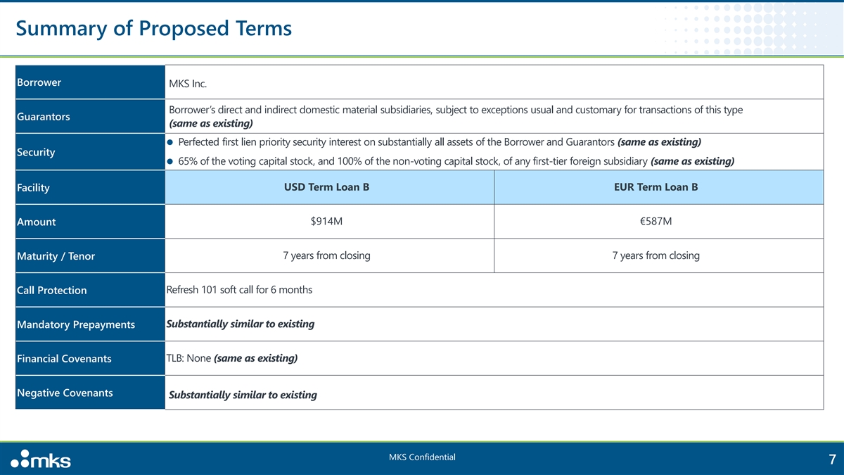 Summary of Proposed Terms Borrower MKS Inc. Borrower’s direct and indirect domestic material subsidiaries, subject to exceptions usual and customary for transactions of this type Guarantors (same as existing) ⚫ Perfected first lien priority security interest on substantially all assets of the Borrower and Guarantors (same as existing) Security 65% of the voting capital stock, and 100% of the non-voting capital stock, of any first-tier foreign subsidiary (same as existing) ⚫ USD Term Loan B EUR Term Loan B Facility $914M €587M Amount Maturity / Tenor 7 years from closing 7 years from closing Call Protection Refresh 101 soft call for 6 months Substantially similar to existing Mandatory Prepayments TLB: None (same as existing) Financial Covenants Negative Covenants Substantially similar to existing MKS Confidential 7