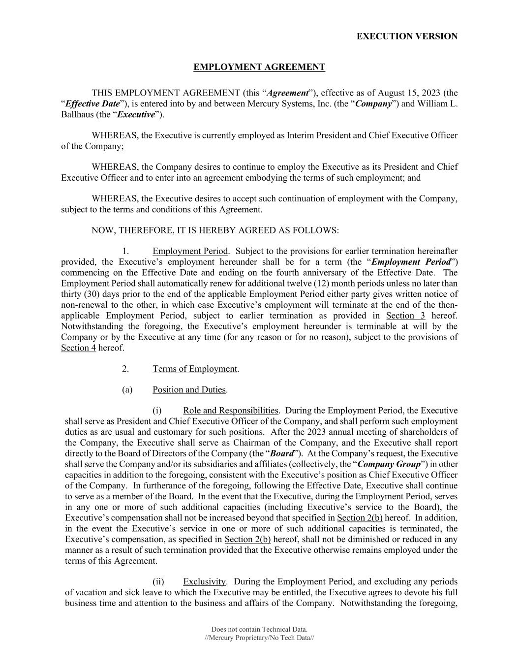 EXECUTION VERSION Does not contain Technical Data. //Mercury Proprietary/No Tech Data// EMPLOYMENT AGREEMENT THIS EMPLOYMENT AGREEMENT (this “Agreement”), effective as of August 15, 2023 (the “Effective Date”), is entered into by and between Mercury Systems, Inc. (the “Company”) and William L. Ballhaus (the “Executive”). WHEREAS, the Executive is currently employed as Interim President and Chief Executive Officer of the Company; WHEREAS, the Company desires to continue to employ the Executive as its President and Chief Executive Officer and to enter into an agreement embodying the terms of such employment; and WHEREAS, the Executive desires to accept such continuation of employment with the Company, subject to the terms and conditions of this Agreement. NOW, THEREFORE, IT IS HEREBY AGREED AS FOLLOWS: 1. Employment Period. Subject to the provisions for earlier termination hereinafter provided, the Executive’s employment hereunder shall be for a term (the “Employment Period”) commencing on the Effective Date and ending on the fourth anniversary of the Effective Date. The Employment Period shall automatically renew for additional twelve (12) month periods unless no later than thirty (30) days prior to the end of the applicable Employment Period either party gives written notice of non-renewal to the other, in which case Executive’s employment will terminate at the end of the then- applicable Employment Period, subject to earlier termination as provided in Section 3 hereof. Notwithstanding the foregoing, the Executive’s employment hereunder is terminable at will by the Company or by the Executive at any time (for any reason or for no reason), subject to the provisions of Section 4 hereof. 2. Terms of Employment. (a) Position and Duties. (i) Role and Responsibilities. During the Employment Period, the Executive shall serve as President and Chief Executive Officer of the Company, and shall perform such employment duties as are usual and customary for such positions. After the 2023 annual meeting of shareholders of the Company, the Executive shall serve as Chairman of the Company, and the Executive shall report directly to the Board of Directors of the Company (the “Board”). At the Company’s request, the Executive shall serve the Company and/or its subsidiaries and affiliates (collectively, the “Company Group”) in other capacities in addition to the foregoing, consistent with the Executive’s position as Chief Executive Officer of the Company. In furtherance of the foregoing, following the Effective Date, Executive shall continue to serve as a member of the Board. In the event that the Executive, during the Employment Period, serves in any one or more of such additional capacities (including Executive’s service to the Board), the Executive’s compensation shall not be increased beyond that specified in Section 2(b) hereof. In addition, in the event the Executive’s service in one or more of such additional capacities is terminated, the Executive’s compensation, as specified in Section 2(b) hereof, shall not be diminished or reduced in any manner as a result of such termination provided that the Executive otherwise remains employed under the terms of this Agreement. (ii) Exclusivity. During the Employment Period, and excluding any periods of vacation and sick leave to which the Executive may be entitled, the Executive agrees to devote his full business time and attention to the business and affairs of the Company. Notwithstanding the foregoing,