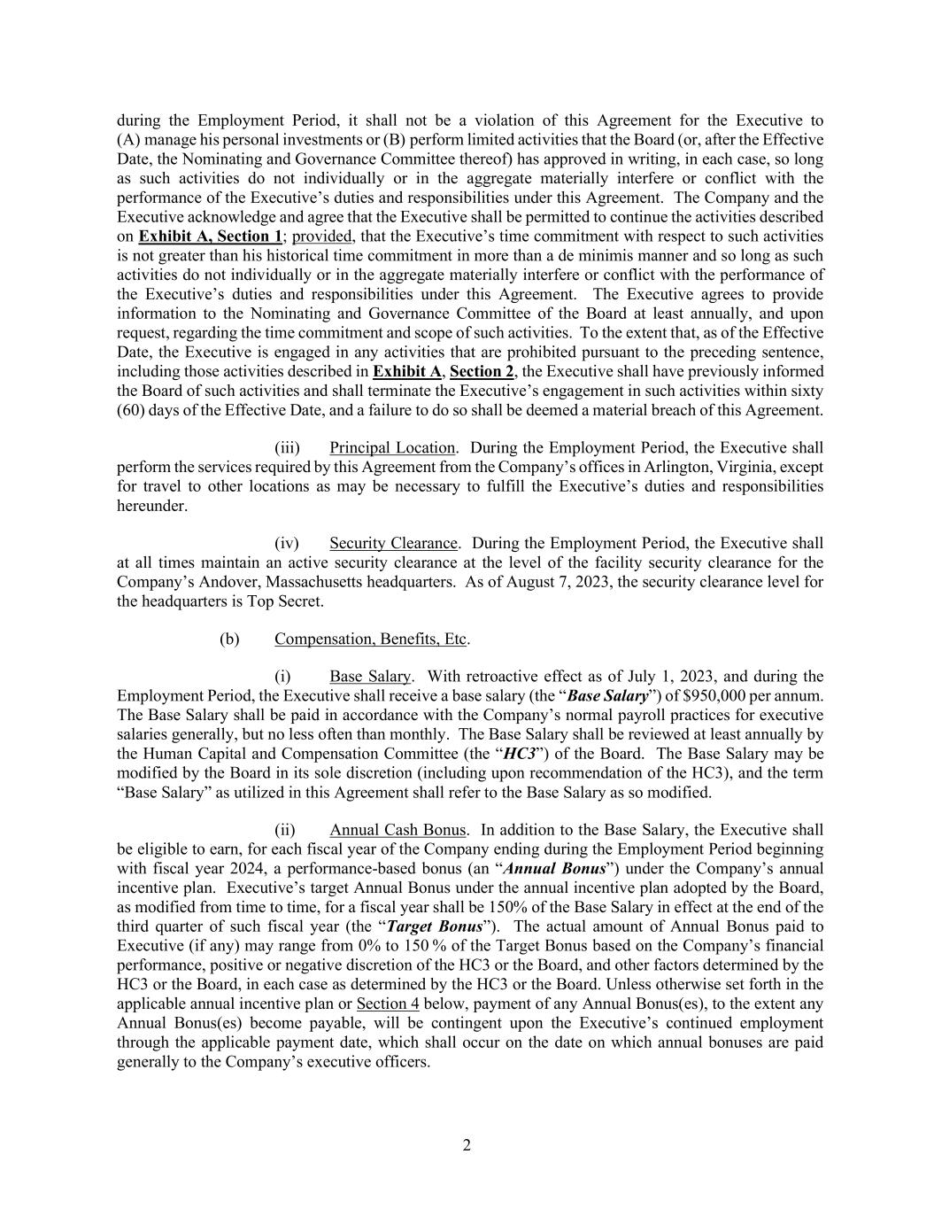 2 during the Employment Period, it shall not be a violation of this Agreement for the Executive to (A) manage his personal investments or (B) perform limited activities that the Board (or, after the Effective Date, the Nominating and Governance Committee thereof) has approved in writing, in each case, so long as such activities do not individually or in the aggregate materially interfere or conflict with the performance of the Executive’s duties and responsibilities under this Agreement. The Company and the Executive acknowledge and agree that the Executive shall be permitted to continue the activities described on Exhibit A, Section 1; provided, that the Executive’s time commitment with respect to such activities is not greater than his historical time commitment in more than a de minimis manner and so long as such activities do not individually or in the aggregate materially interfere or conflict with the performance of the Executive’s duties and responsibilities under this Agreement. The Executive agrees to provide information to the Nominating and Governance Committee of the Board at least annually, and upon request, regarding the time commitment and scope of such activities. To the extent that, as of the Effective Date, the Executive is engaged in any activities that are prohibited pursuant to the preceding sentence, including those activities described in Exhibit A, Section 2, the Executive shall have previously informed the Board of such activities and shall terminate the Executive’s engagement in such activities within sixty (60) days of the Effective Date, and a failure to do so shall be deemed a material breach of this Agreement. (iii) Principal Location. During the Employment Period, the Executive shall perform the services required by this Agreement from the Company’s offices in Arlington, Virginia, except for travel to other locations as may be necessary to fulfill the Executive’s duties and responsibilities hereunder. (iv) Security Clearance. During the Employment Period, the Executive shall at all times maintain an active security clearance at the level of the facility security clearance for the Company’s Andover, Massachusetts headquarters. As of August 7, 2023, the security clearance level for the headquarters is Top Secret. (b) Compensation, Benefits, Etc. (i) Base Salary. With retroactive effect as of July 1, 2023, and during the Employment Period, the Executive shall receive a base salary (the “Base Salary”) of $950,000 per annum. The Base Salary shall be paid in accordance with the Company’s normal payroll practices for executive salaries generally, but no less often than monthly. The Base Salary shall be reviewed at least annually by the Human Capital and Compensation Committee (the “HC3”) of the Board. The Base Salary may be modified by the Board in its sole discretion (including upon recommendation of the HC3), and the term “Base Salary” as utilized in this Agreement shall refer to the Base Salary as so modified. (ii) Annual Cash Bonus. In addition to the Base Salary, the Executive shall be eligible to earn, for each fiscal year of the Company ending during the Employment Period beginning with fiscal year 2024, a performance-based bonus (an “Annual Bonus”) under the Company’s annual incentive plan. Executive’s target Annual Bonus under the annual incentive plan adopted by the Board, as modified from time to time, for a fiscal year shall be 150% of the Base Salary in effect at the end of the third quarter of such fiscal year (the “Target Bonus”). The actual amount of Annual Bonus paid to Executive (if any) may range from 0% to 150 % of the Target Bonus based on the Company’s financial performance, positive or negative discretion of the HC3 or the Board, and other factors determined by the HC3 or the Board, in each case as determined by the HC3 or the Board. Unless otherwise set forth in the applicable annual incentive plan or Section 4 below, payment of any Annual Bonus(es), to the extent any Annual Bonus(es) become payable, will be contingent upon the Executive’s continued employment through the applicable payment date, which shall occur on the date on which annual bonuses are paid generally to the Company’s executive officers.