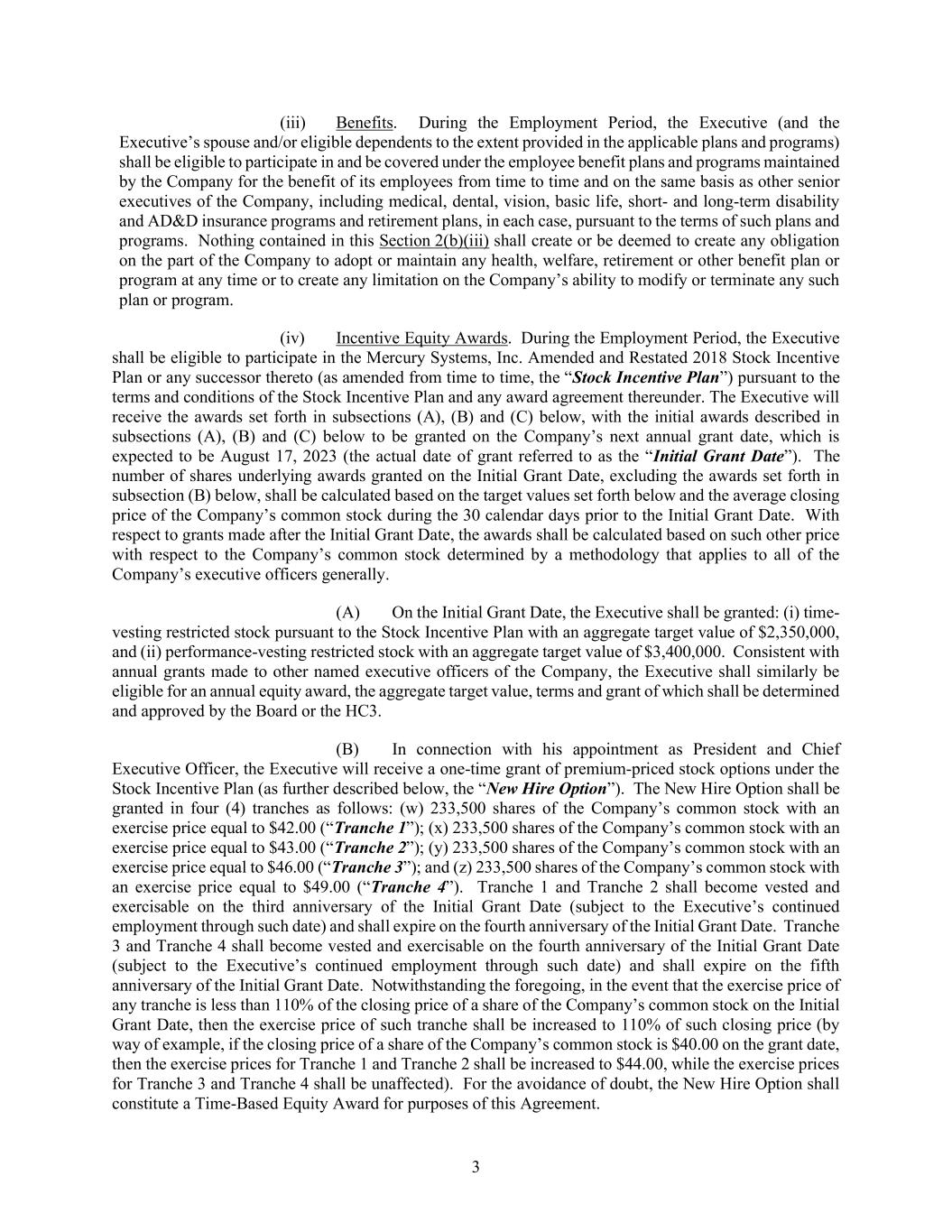 3 (iii) Benefits. During the Employment Period, the Executive (and the Executive’s spouse and/or eligible dependents to the extent provided in the applicable plans and programs) shall be eligible to participate in and be covered under the employee benefit plans and programs maintained by the Company for the benefit of its employees from time to time and on the same basis as other senior executives of the Company, including medical, dental, vision, basic life, short- and long-term disability and AD&D insurance programs and retirement plans, in each case, pursuant to the terms of such plans and programs. Nothing contained in this Section 2(b)(iii) shall create or be deemed to create any obligation on the part of the Company to adopt or maintain any health, welfare, retirement or other benefit plan or program at any time or to create any limitation on the Company’s ability to modify or terminate any such plan or program. (iv) Incentive Equity Awards. During the Employment Period, the Executive shall be eligible to participate in the Mercury Systems, Inc. Amended and Restated 2018 Stock Incentive Plan or any successor thereto (as amended from time to time, the “Stock Incentive Plan”) pursuant to the terms and conditions of the Stock Incentive Plan and any award agreement thereunder. The Executive will receive the awards set forth in subsections (A), (B) and (C) below, with the initial awards described in subsections (A), (B) and (C) below to be granted on the Company’s next annual grant date, which is expected to be August 17, 2023 (the actual date of grant referred to as the “Initial Grant Date”). The number of shares underlying awards granted on the Initial Grant Date, excluding the awards set forth in subsection (B) below, shall be calculated based on the target values set forth below and the average closing price of the Company’s common stock during the 30 calendar days prior to the Initial Grant Date. With respect to grants made after the Initial Grant Date, the awards shall be calculated based on such other price with respect to the Company’s common stock determined by a methodology that applies to all of the Company’s executive officers generally. (A) On the Initial Grant Date, the Executive shall be granted: (i) time- vesting restricted stock pursuant to the Stock Incentive Plan with an aggregate target value of $2,350,000, and (ii) performance-vesting restricted stock with an aggregate target value of $3,400,000. Consistent with annual grants made to other named executive officers of the Company, the Executive shall similarly be eligible for an annual equity award, the aggregate target value, terms and grant of which shall be determined and approved by the Board or the HC3. (B) In connection with his appointment as President and Chief Executive Officer, the Executive will receive a one-time grant of premium-priced stock options under the Stock Incentive Plan (as further described below, the “New Hire Option”). The New Hire Option shall be granted in four (4) tranches as follows: (w) 233,500 shares of the Company’s common stock with an exercise price equal to $42.00 (“Tranche 1”); (x) 233,500 shares of the Company’s common stock with an exercise price equal to $43.00 (“Tranche 2”); (y) 233,500 shares of the Company’s common stock with an exercise price equal to $46.00 (“Tranche 3”); and (z) 233,500 shares of the Company’s common stock with an exercise price equal to $49.00 (“Tranche 4”). Tranche 1 and Tranche 2 shall become vested and exercisable on the third anniversary of the Initial Grant Date (subject to the Executive’s continued employment through such date) and shall expire on the fourth anniversary of the Initial Grant Date. Tranche 3 and Tranche 4 shall become vested and exercisable on the fourth anniversary of the Initial Grant Date (subject to the Executive’s continued employment through such date) and shall expire on the fifth anniversary of the Initial Grant Date. Notwithstanding the foregoing, in the event that the exercise price of any tranche is less than 110% of the closing price of a share of the Company’s common stock on the Initial Grant Date, then the exercise price of such tranche shall be increased to 110% of such closing price (by way of example, if the closing price of a share of the Company’s common stock is $40.00 on the grant date, then the exercise prices for Tranche 1 and Tranche 2 shall be increased to $44.00, while the exercise prices for Tranche 3 and Tranche 4 shall be unaffected). For the avoidance of doubt, the New Hire Option shall constitute a Time-Based Equity Award for purposes of this Agreement.