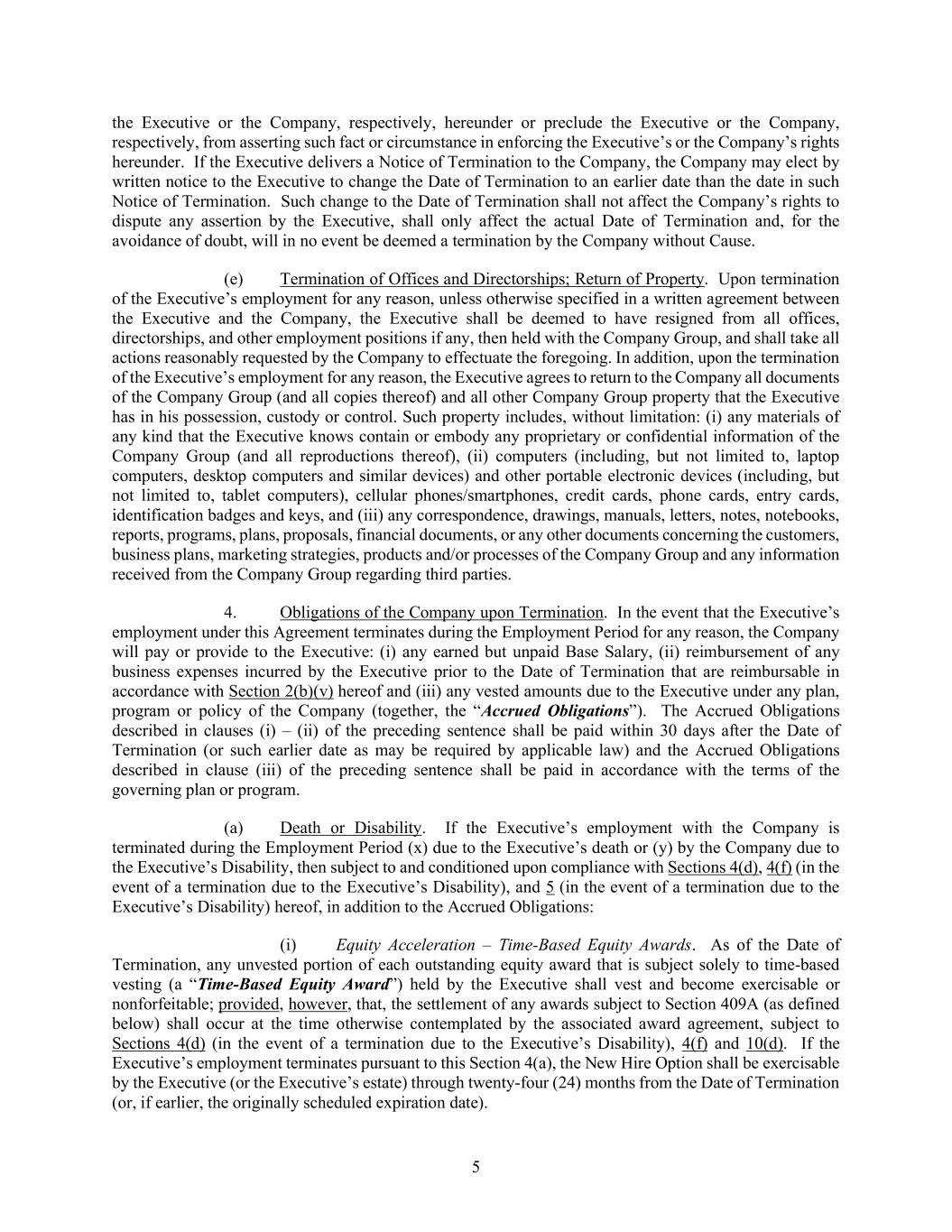 5 the Executive or the Company, respectively, hereunder or preclude the Executive or the Company, respectively, from asserting such fact or circumstance in enforcing the Executive’s or the Company’s rights hereunder. If the Executive delivers a Notice of Termination to the Company, the Company may elect by written notice to the Executive to change the Date of Termination to an earlier date than the date in such Notice of Termination. Such change to the Date of Termination shall not affect the Company’s rights to dispute any assertion by the Executive, shall only affect the actual Date of Termination and, for the avoidance of doubt, will in no event be deemed a termination by the Company without Cause. (e) Termination of Offices and Directorships; Return of Property. Upon termination of the Executive’s employment for any reason, unless otherwise specified in a written agreement between the Executive and the Company, the Executive shall be deemed to have resigned from all offices, directorships, and other employment positions if any, then held with the Company Group, and shall take all actions reasonably requested by the Company to effectuate the foregoing. In addition, upon the termination of the Executive’s employment for any reason, the Executive agrees to return to the Company all documents of the Company Group (and all copies thereof) and all other Company Group property that the Executive has in his possession, custody or control. Such property includes, without limitation: (i) any materials of any kind that the Executive knows contain or embody any proprietary or confidential information of the Company Group (and all reproductions thereof), (ii) computers (including, but not limited to, laptop computers, desktop computers and similar devices) and other portable electronic devices (including, but not limited to, tablet computers), cellular phones/smartphones, credit cards, phone cards, entry cards, identification badges and keys, and (iii) any correspondence, drawings, manuals, letters, notes, notebooks, reports, programs, plans, proposals, financial documents, or any other documents concerning the customers, business plans, marketing strategies, products and/or processes of the Company Group and any information received from the Company Group regarding third parties. 4. Obligations of the Company upon Termination. In the event that the Executive’s employment under this Agreement terminates during the Employment Period for any reason, the Company will pay or provide to the Executive: (i) any earned but unpaid Base Salary, (ii) reimbursement of any business expenses incurred by the Executive prior to the Date of Termination that are reimbursable in accordance with Section 2(b)(v) hereof and (iii) any vested amounts due to the Executive under any plan, program or policy of the Company (together, the “Accrued Obligations”). The Accrued Obligations described in clauses (i) – (ii) of the preceding sentence shall be paid within 30 days after the Date of Termination (or such earlier date as may be required by applicable law) and the Accrued Obligations described in clause (iii) of the preceding sentence shall be paid in accordance with the terms of the governing plan or program. (a) Death or Disability. If the Executive’s employment with the Company is terminated during the Employment Period (x) due to the Executive’s death or (y) by the Company due to the Executive’s Disability, then subject to and conditioned upon compliance with Sections 4(d), 4(f) (in the event of a termination due to the Executive’s Disability), and 5 (in the event of a termination due to the Executive’s Disability) hereof, in addition to the Accrued Obligations: (i) Equity Acceleration – Time-Based Equity Awards. As of the Date of Termination, any unvested portion of each outstanding equity award that is subject solely to time-based vesting (a “Time-Based Equity Award”) held by the Executive shall vest and become exercisable or nonforfeitable; provided, however, that, the settlement of any awards subject to Section 409A (as defined below) shall occur at the time otherwise contemplated by the associated award agreement, subject to Sections 4(d) (in the event of a termination due to the Executive’s Disability), 4(f) and 10(d). If the Executive’s employment terminates pursuant to this Section 4(a), the New Hire Option shall be exercisable by the Executive (or the Executive’s estate) through twenty-four (24) months from the Date of Termination (or, if earlier, the originally scheduled expiration date).