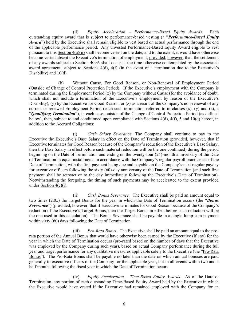 6 (ii) Equity Acceleration – Performance-Based Equity Awards. Each outstanding equity award that is subject to performance-based vesting (a “Performance-Based Equity Award”) held by the Executive shall remain eligible to vest based on actual performance through the end of the applicable performance period. Any unvested Performance-Based Equity Award eligible to vest pursuant to this Section 4(a)(ii) shall become vested on the date, and to the extent, it would have otherwise become vested absent the Executive’s termination of employment; provided, however, that, the settlement of any awards subject to Section 409A shall occur at the time otherwise contemplated by the associated award agreement, subject to Sections 4(d), 4(f) (in the event of a termination due to the Executive’s Disability) and 10(d). (b) Without Cause, For Good Reason, or Non-Renewal of Employment Period (Outside of Change of Control Protection Period). If the Executive’s employment with the Company is terminated during the Employment Period (x) by the Company without Cause (for the avoidance of doubt, which shall not include a termination of the Executive’s employment by reason of the Executive’s Disability), (y) by the Executive for Good Reason, or (z) as a result of the Company’s non-renewal of any current or renewed Employment Period (each such termination referred to in clauses (x), (y) and (z), a “Qualifying Termination”), in each case, outside of the Change of Control Protection Period (as defined below), then, subject to and conditioned upon compliance with Sections 4(d), 4(f), 5 and 10(d) hereof, in addition to the Accrued Obligations: (i) Cash Salary Severance. The Company shall continue to pay to the Executive the Executive’s Base Salary in effect on the Date of Termination (provided, however, that if Executive terminates for Good Reason because of the Company’s reduction of the Executive’s Base Salary, then the Base Salary in effect before such material reduction will be the one continued) during the period beginning on the Date of Termination and ending on the twenty-four (24)-month anniversary of the Date of Termination in equal installments in accordance with the Company’s regular payroll practices as of the Date of Termination, with the first payment being due and payable on the Company’s next regular payday for executive officers following the sixty (60)-day anniversary of the Date of Termination (and such first payment shall be retroactive to the day immediately following the Executive’s Date of Termination). Notwithstanding the foregoing, the timing of such payments may be accelerated to the extent provided under Section 4(c)(i). (ii) Cash Bonus Severance. The Executive shall be paid an amount equal to two times (2.0x) the Target Bonus for the year in which the Date of Termination occurs (the “Bonus Severance”) (provided, however, that if Executive terminates for Good Reason because of the Company’s reduction of the Executive’s Target Bonus, then the Target Bonus in effect before such reduction will be the one used in this calculation). The Bonus Severance shall be payable in a single lump-sum payment within sixty (60) days following the Date of Termination. (iii) Pro-Rata Bonus. The Executive shall be paid an amount equal to the pro- rata portion of the Annual Bonus that would have otherwise been earned by the Executive (if any) for the year in which the Date of Termination occurs (pro-rated based on the number of days that the Executive was employed by the Company during such year), based on actual Company performance during the full year and target performance for any qualitative measures applicable solely to the Executive (the “Pro-Rata Bonus”). The Pro-Rata Bonus shall be payable no later than the date on which annual bonuses are paid generally to executive officers of the Company for the applicable year, but in all events within two and a half months following the fiscal year in which the Date of Termination occurs. (iv) Equity Acceleration – Time-Based Equity Awards. As of the Date of Termination, any portion of each outstanding Time-Based Equity Award held by the Executive in which the Executive would have vested if the Executive had remained employed with the Company for an