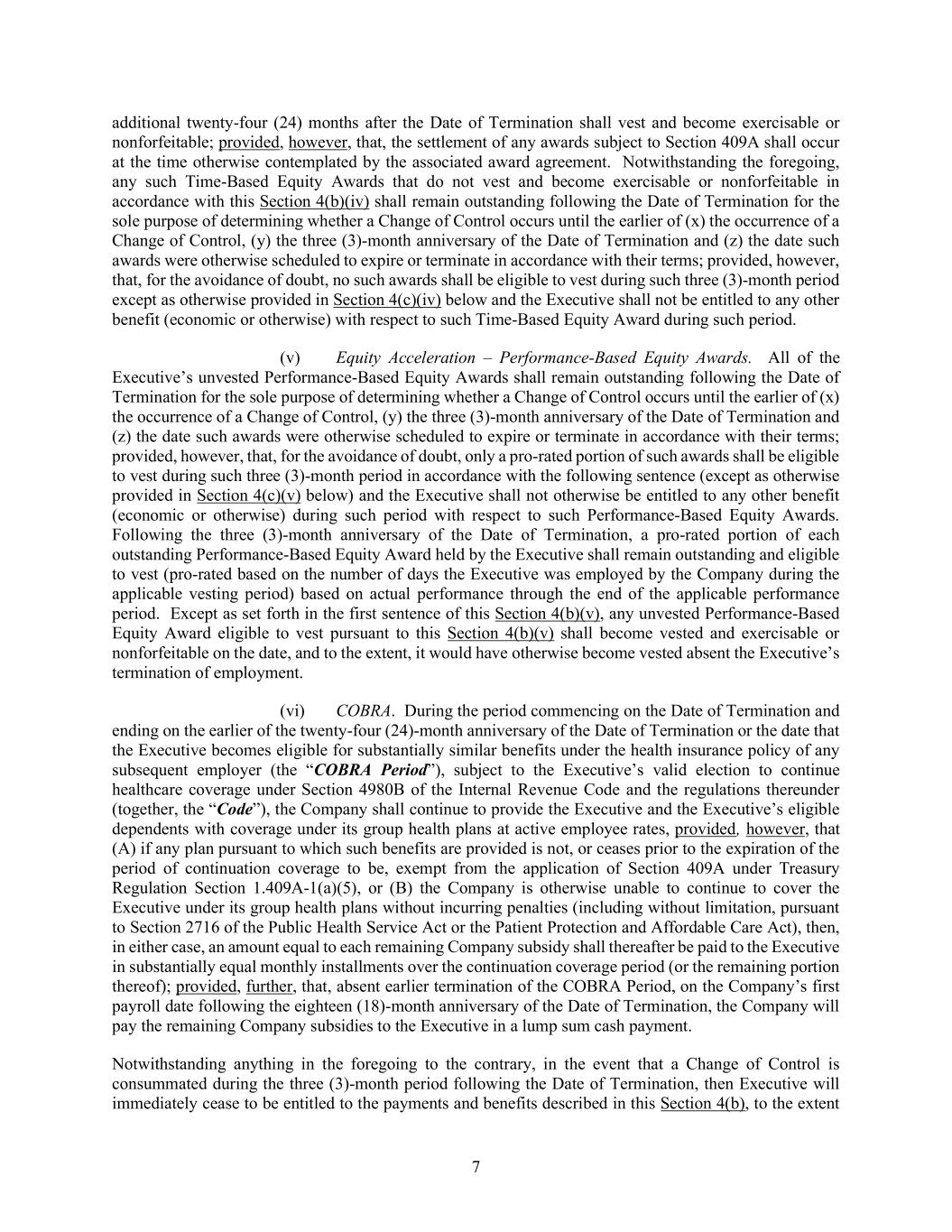 7 additional twenty-four (24) months after the Date of Termination shall vest and become exercisable or nonforfeitable; provided, however, that, the settlement of any awards subject to Section 409A shall occur at the time otherwise contemplated by the associated award agreement. Notwithstanding the foregoing, any such Time-Based Equity Awards that do not vest and become exercisable or nonforfeitable in accordance with this Section 4(b)(iv) shall remain outstanding following the Date of Termination for the sole purpose of determining whether a Change of Control occurs until the earlier of (x) the occurrence of a Change of Control, (y) the three (3)-month anniversary of the Date of Termination and (z) the date such awards were otherwise scheduled to expire or terminate in accordance with their terms; provided, however, that, for the avoidance of doubt, no such awards shall be eligible to vest during such three (3)-month period except as otherwise provided in Section 4(c)(iv) below and the Executive shall not be entitled to any other benefit (economic or otherwise) with respect to such Time-Based Equity Award during such period. (v) Equity Acceleration – Performance-Based Equity Awards. All of the Executive’s unvested Performance-Based Equity Awards shall remain outstanding following the Date of Termination for the sole purpose of determining whether a Change of Control occurs until the earlier of (x) the occurrence of a Change of Control, (y) the three (3)-month anniversary of the Date of Termination and (z) the date such awards were otherwise scheduled to expire or terminate in accordance with their terms; provided, however, that, for the avoidance of doubt, only a pro-rated portion of such awards shall be eligible to vest during such three (3)-month period in accordance with the following sentence (except as otherwise provided in Section 4(c)(v) below) and the Executive shall not otherwise be entitled to any other benefit (economic or otherwise) during such period with respect to such Performance-Based Equity Awards. Following the three (3)-month anniversary of the Date of Termination, a pro-rated portion of each outstanding Performance-Based Equity Award held by the Executive shall remain outstanding and eligible to vest (pro-rated based on the number of days the Executive was employed by the Company during the applicable vesting period) based on actual performance through the end of the applicable performance period. Except as set forth in the first sentence of this Section 4(b)(v), any unvested Performance-Based Equity Award eligible to vest pursuant to this Section 4(b)(v) shall become vested and exercisable or nonforfeitable on the date, and to the extent, it would have otherwise become vested absent the Executive’s termination of employment. (vi) COBRA. During the period commencing on the Date of Termination and ending on the earlier of the twenty-four (24)-month anniversary of the Date of Termination or the date that the Executive becomes eligible for substantially similar benefits under the health insurance policy of any subsequent employer (the “COBRA Period”), subject to the Executive’s valid election to continue healthcare coverage under Section 4980B of the Internal Revenue Code and the regulations thereunder (together, the “Code”), the Company shall continue to provide the Executive and the Executive’s eligible dependents with coverage under its group health plans at active employee rates, provided, however, that (A) if any plan pursuant to which such benefits are provided is not, or ceases prior to the expiration of the period of continuation coverage to be, exempt from the application of Section 409A under Treasury Regulation Section 1.409A-1(a)(5), or (B) the Company is otherwise unable to continue to cover the Executive under its group health plans without incurring penalties (including without limitation, pursuant to Section 2716 of the Public Health Service Act or the Patient Protection and Affordable Care Act), then, in either case, an amount equal to each remaining Company subsidy shall thereafter be paid to the Executive in substantially equal monthly installments over the continuation coverage period (or the remaining portion thereof); provided, further, that, absent earlier termination of the COBRA Period, on the Company’s first payroll date following the eighteen (18)-month anniversary of the Date of Termination, the Company will pay the remaining Company subsidies to the Executive in a lump sum cash payment. Notwithstanding anything in the foregoing to the contrary, in the event that a Change of Control is consummated during the three (3)-month period following the Date of Termination, then Executive will immediately cease to be entitled to the payments and benefits described in this Section 4(b), to the extent