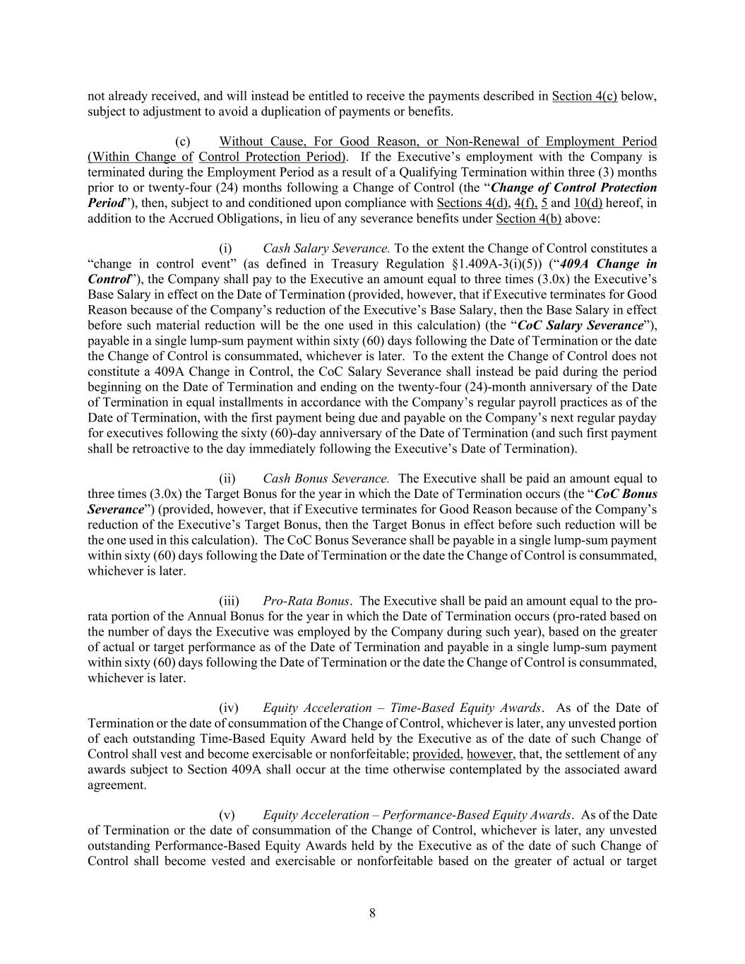 8 not already received, and will instead be entitled to receive the payments described in Section 4(c) below, subject to adjustment to avoid a duplication of payments or benefits. (c) Without Cause, For Good Reason, or Non-Renewal of Employment Period (Within Change of Control Protection Period). If the Executive’s employment with the Company is terminated during the Employment Period as a result of a Qualifying Termination within three (3) months prior to or twenty-four (24) months following a Change of Control (the “Change of Control Protection Period”), then, subject to and conditioned upon compliance with Sections 4(d), 4(f), 5 and 10(d) hereof, in addition to the Accrued Obligations, in lieu of any severance benefits under Section 4(b) above: (i) Cash Salary Severance. To the extent the Change of Control constitutes a “change in control event” (as defined in Treasury Regulation §1.409A-3(i)(5)) (“409A Change in Control”), the Company shall pay to the Executive an amount equal to three times (3.0x) the Executive’s Base Salary in effect on the Date of Termination (provided, however, that if Executive terminates for Good Reason because of the Company’s reduction of the Executive’s Base Salary, then the Base Salary in effect before such material reduction will be the one used in this calculation) (the “CoC Salary Severance”), payable in a single lump-sum payment within sixty (60) days following the Date of Termination or the date the Change of Control is consummated, whichever is later. To the extent the Change of Control does not constitute a 409A Change in Control, the CoC Salary Severance shall instead be paid during the period beginning on the Date of Termination and ending on the twenty-four (24)-month anniversary of the Date of Termination in equal installments in accordance with the Company’s regular payroll practices as of the Date of Termination, with the first payment being due and payable on the Company’s next regular payday for executives following the sixty (60)-day anniversary of the Date of Termination (and such first payment shall be retroactive to the day immediately following the Executive’s Date of Termination). (ii) Cash Bonus Severance. The Executive shall be paid an amount equal to three times (3.0x) the Target Bonus for the year in which the Date of Termination occurs (the “CoC Bonus Severance”) (provided, however, that if Executive terminates for Good Reason because of the Company’s reduction of the Executive’s Target Bonus, then the Target Bonus in effect before such reduction will be the one used in this calculation). The CoC Bonus Severance shall be payable in a single lump-sum payment within sixty (60) days following the Date of Termination or the date the Change of Control is consummated, whichever is later. (iii) Pro-Rata Bonus. The Executive shall be paid an amount equal to the pro- rata portion of the Annual Bonus for the year in which the Date of Termination occurs (pro-rated based on the number of days the Executive was employed by the Company during such year), based on the greater of actual or target performance as of the Date of Termination and payable in a single lump-sum payment within sixty (60) days following the Date of Termination or the date the Change of Control is consummated, whichever is later. (iv) Equity Acceleration – Time-Based Equity Awards. As of the Date of Termination or the date of consummation of the Change of Control, whichever is later, any unvested portion of each outstanding Time-Based Equity Award held by the Executive as of the date of such Change of Control shall vest and become exercisable or nonforfeitable; provided, however, that, the settlement of any awards subject to Section 409A shall occur at the time otherwise contemplated by the associated award agreement. (v) Equity Acceleration – Performance-Based Equity Awards. As of the Date of Termination or the date of consummation of the Change of Control, whichever is later, any unvested outstanding Performance-Based Equity Awards held by the Executive as of the date of such Change of Control shall become vested and exercisable or nonforfeitable based on the greater of actual or target