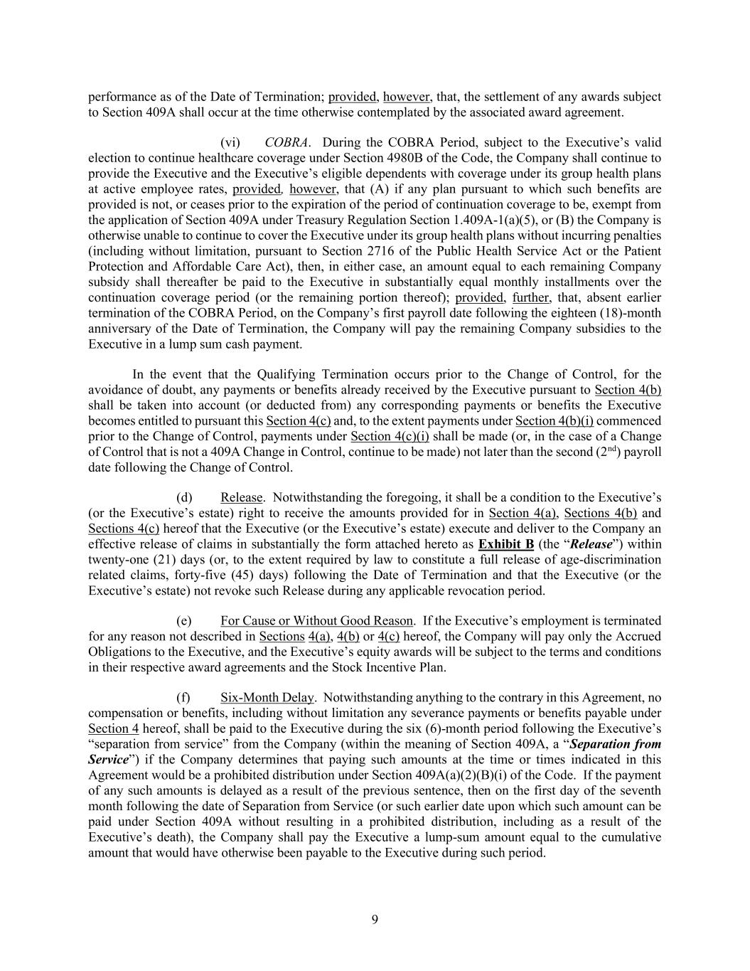 9 performance as of the Date of Termination; provided, however, that, the settlement of any awards subject to Section 409A shall occur at the time otherwise contemplated by the associated award agreement. (vi) COBRA. During the COBRA Period, subject to the Executive’s valid election to continue healthcare coverage under Section 4980B of the Code, the Company shall continue to provide the Executive and the Executive’s eligible dependents with coverage under its group health plans at active employee rates, provided, however, that (A) if any plan pursuant to which such benefits are provided is not, or ceases prior to the expiration of the period of continuation coverage to be, exempt from the application of Section 409A under Treasury Regulation Section 1.409A-1(a)(5), or (B) the Company is otherwise unable to continue to cover the Executive under its group health plans without incurring penalties (including without limitation, pursuant to Section 2716 of the Public Health Service Act or the Patient Protection and Affordable Care Act), then, in either case, an amount equal to each remaining Company subsidy shall thereafter be paid to the Executive in substantially equal monthly installments over the continuation coverage period (or the remaining portion thereof); provided, further, that, absent earlier termination of the COBRA Period, on the Company’s first payroll date following the eighteen (18)-month anniversary of the Date of Termination, the Company will pay the remaining Company subsidies to the Executive in a lump sum cash payment. In the event that the Qualifying Termination occurs prior to the Change of Control, for the avoidance of doubt, any payments or benefits already received by the Executive pursuant to Section 4(b) shall be taken into account (or deducted from) any corresponding payments or benefits the Executive becomes entitled to pursuant this Section 4(c) and, to the extent payments under Section 4(b)(i) commenced prior to the Change of Control, payments under Section 4(c)(i) shall be made (or, in the case of a Change of Control that is not a 409A Change in Control, continue to be made) not later than the second (2nd) payroll date following the Change of Control. (d) Release. Notwithstanding the foregoing, it shall be a condition to the Executive’s (or the Executive’s estate) right to receive the amounts provided for in Section 4(a), Sections 4(b) and Sections 4(c) hereof that the Executive (or the Executive’s estate) execute and deliver to the Company an effective release of claims in substantially the form attached hereto as Exhibit B (the “Release”) within twenty-one (21) days (or, to the extent required by law to constitute a full release of age-discrimination related claims, forty-five (45) days) following the Date of Termination and that the Executive (or the Executive’s estate) not revoke such Release during any applicable revocation period. (e) For Cause or Without Good Reason. If the Executive’s employment is terminated for any reason not described in Sections 4(a), 4(b) or 4(c) hereof, the Company will pay only the Accrued Obligations to the Executive, and the Executive’s equity awards will be subject to the terms and conditions in their respective award agreements and the Stock Incentive Plan. (f) Six-Month Delay. Notwithstanding anything to the contrary in this Agreement, no compensation or benefits, including without limitation any severance payments or benefits payable under Section 4 hereof, shall be paid to the Executive during the six (6)-month period following the Executive’s “separation from service” from the Company (within the meaning of Section 409A, a “Separation from Service”) if the Company determines that paying such amounts at the time or times indicated in this Agreement would be a prohibited distribution under Section 409A(a)(2)(B)(i) of the Code. If the payment of any such amounts is delayed as a result of the previous sentence, then on the first day of the seventh month following the date of Separation from Service (or such earlier date upon which such amount can be paid under Section 409A without resulting in a prohibited distribution, including as a result of the Executive’s death), the Company shall pay the Executive a lump-sum amount equal to the cumulative amount that would have otherwise been payable to the Executive during such period.
