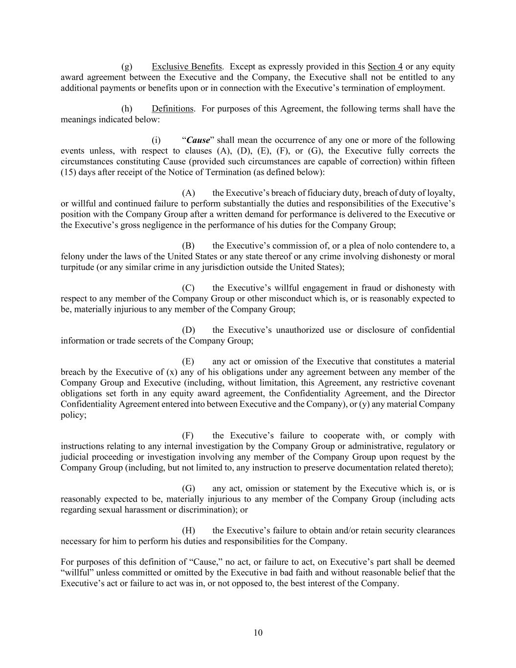 10 (g) Exclusive Benefits. Except as expressly provided in this Section 4 or any equity award agreement between the Executive and the Company, the Executive shall not be entitled to any additional payments or benefits upon or in connection with the Executive’s termination of employment. (h) Definitions. For purposes of this Agreement, the following terms shall have the meanings indicated below: (i) “Cause” shall mean the occurrence of any one or more of the following events unless, with respect to clauses (A), (D), (E), (F), or (G), the Executive fully corrects the circumstances constituting Cause (provided such circumstances are capable of correction) within fifteen (15) days after receipt of the Notice of Termination (as defined below): (A) the Executive’s breach of fiduciary duty, breach of duty of loyalty, or willful and continued failure to perform substantially the duties and responsibilities of the Executive’s position with the Company Group after a written demand for performance is delivered to the Executive or the Executive’s gross negligence in the performance of his duties for the Company Group; (B) the Executive’s commission of, or a plea of nolo contendere to, a felony under the laws of the United States or any state thereof or any crime involving dishonesty or moral turpitude (or any similar crime in any jurisdiction outside the United States); (C) the Executive’s willful engagement in fraud or dishonesty with respect to any member of the Company Group or other misconduct which is, or is reasonably expected to be, materially injurious to any member of the Company Group; (D) the Executive’s unauthorized use or disclosure of confidential information or trade secrets of the Company Group; (E) any act or omission of the Executive that constitutes a material breach by the Executive of (x) any of his obligations under any agreement between any member of the Company Group and Executive (including, without limitation, this Agreement, any restrictive covenant obligations set forth in any equity award agreement, the Confidentiality Agreement, and the Director Confidentiality Agreement entered into between Executive and the Company), or (y) any material Company policy; (F) the Executive’s failure to cooperate with, or comply with instructions relating to any internal investigation by the Company Group or administrative, regulatory or judicial proceeding or investigation involving any member of the Company Group upon request by the Company Group (including, but not limited to, any instruction to preserve documentation related thereto); (G) any act, omission or statement by the Executive which is, or is reasonably expected to be, materially injurious to any member of the Company Group (including acts regarding sexual harassment or discrimination); or (H) the Executive’s failure to obtain and/or retain security clearances necessary for him to perform his duties and responsibilities for the Company. For purposes of this definition of “Cause,” no act, or failure to act, on Executive’s part shall be deemed “willful” unless committed or omitted by the Executive in bad faith and without reasonable belief that the Executive’s act or failure to act was in, or not opposed to, the best interest of the Company.